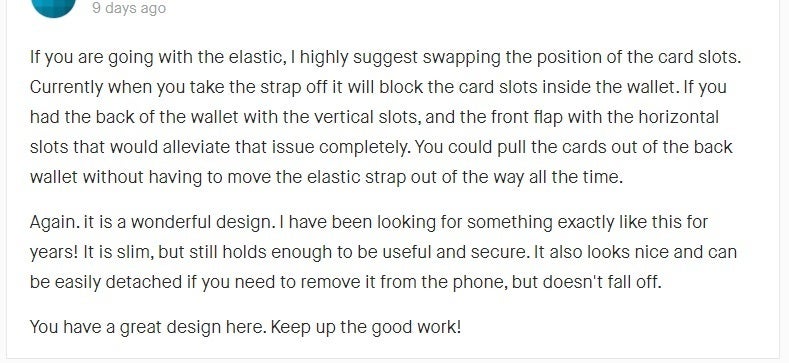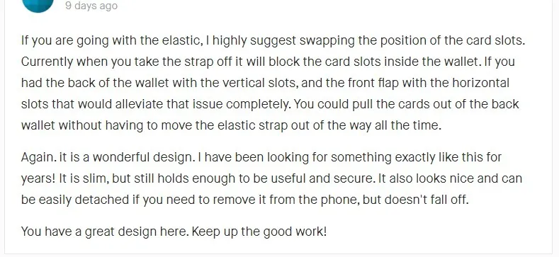 ゴムストラップを使用する場合は、カードスロットの位置を入れ替えることを強くお勧めします。 現在、ストラップを外すと、ウォレット内のカードスロットがブロックされます。 財布の背面に垂直スロットがあり、前面フラップに水平スロットがある場合は、この問題を完全に軽減できます。 ゴムストラップを常に邪魔にならないように動かすことなく、カードを財布から引き出すことができます。