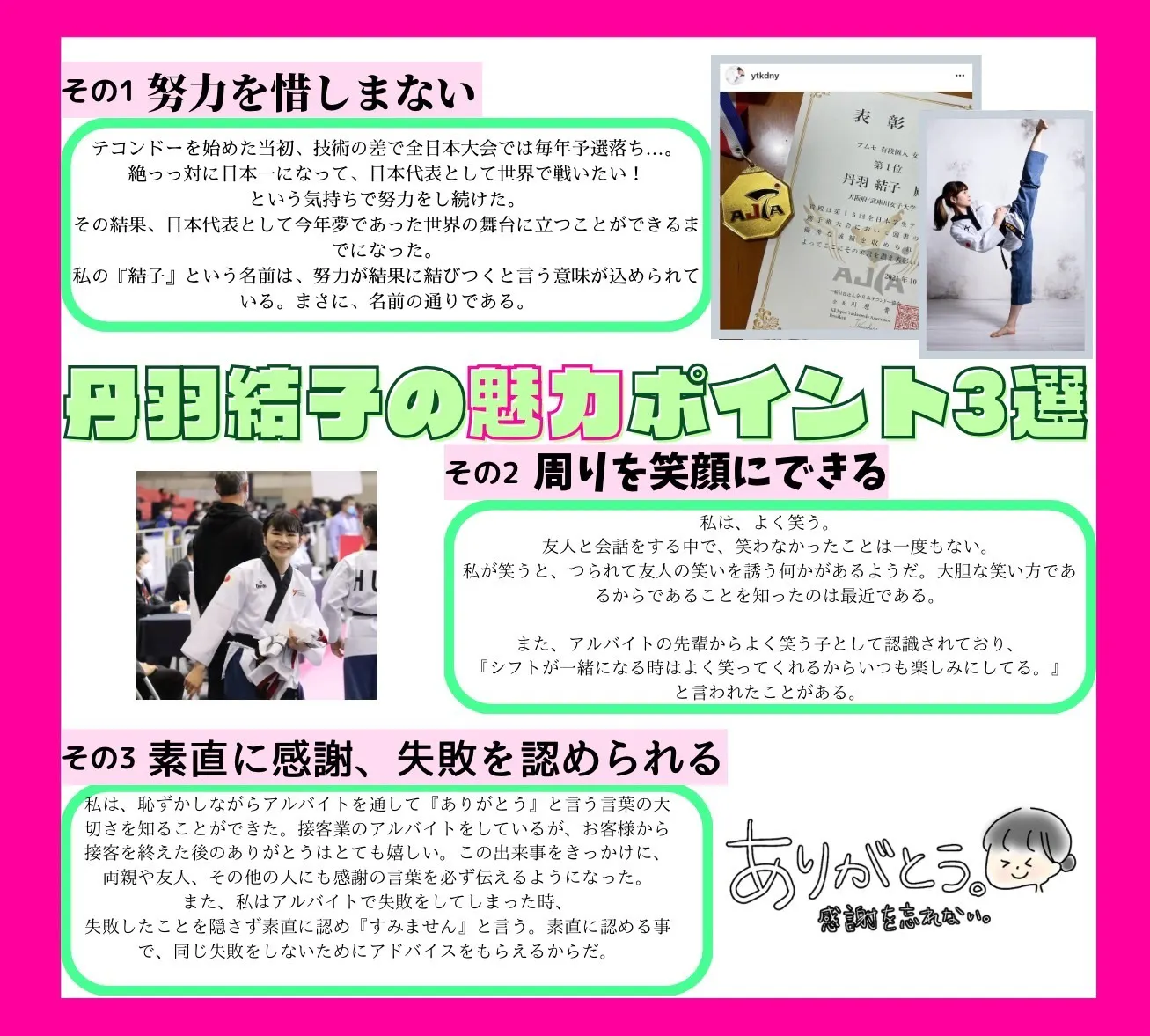テコンドー競技のプムセと、フリースタイル日本代表の丹羽結子(にわゆいこ)と申します。
