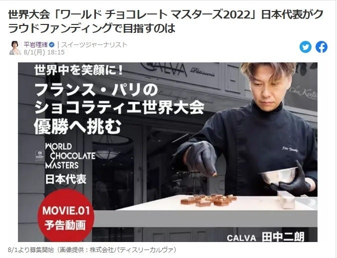 スイーツジャーナリストの平岩理緒様がこのクラウドファンディングについて執筆した記事がYAHOOニュースにて掲載されました!!YAHOOニュース記事はコチラhttps://news.yahoo.co.jp/byline/hiraiwario/20220801-00307905・田中の本大会に向けての想い、未来の若い菓子職人に向けてのインタビュー・ワールドチョコレートマスターズの変遷・歴代の代表シェフの当時の状況について・ワールド チョコレート マスターズ日本運営委員会 、協賛スポンサー様について等々、平岩様のスイーツジャーナリストとしての視点で、かなり読み応えのある内容を掲載頂いております。是非目を通していただき、皆様により知っていただければと思います。来週初旬に、また次の動画をUPする予定ですので是非お楽しみに!!!