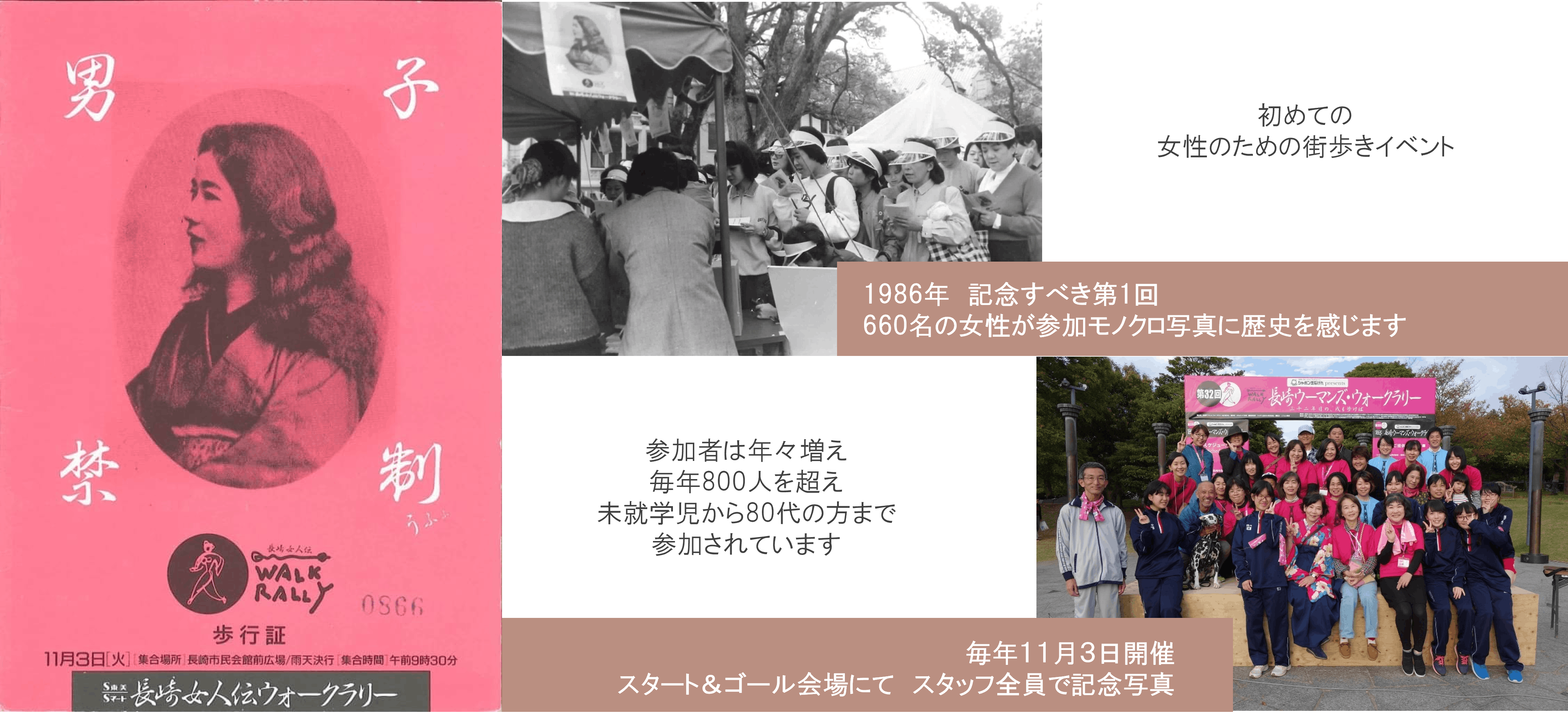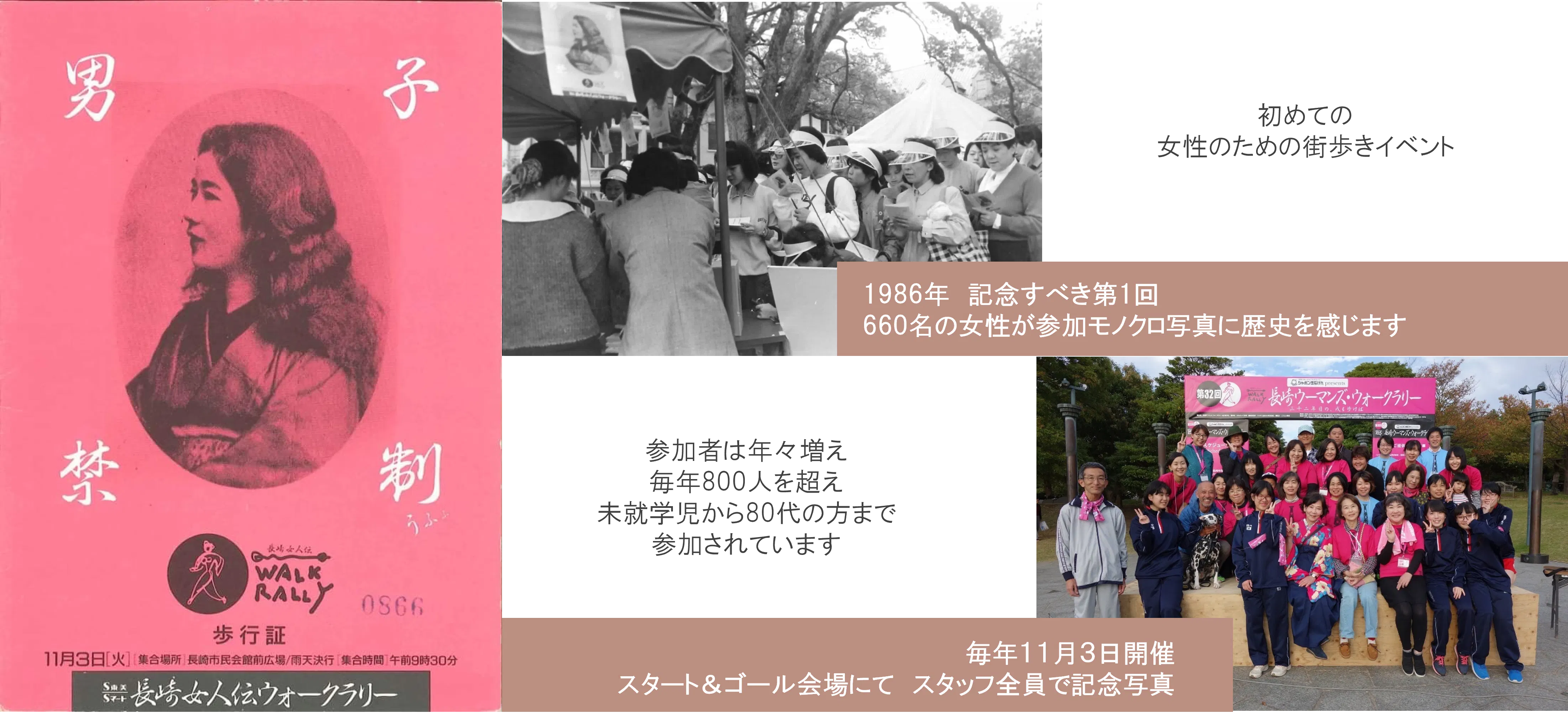 35年間、一度も同じコースはありません。歩けば歩くほど新しい発見がある長崎。飽きることはありません。20年目に、男性の方々の熱いエールから「男子解禁」が実現、参加者は1,200人を超えました。