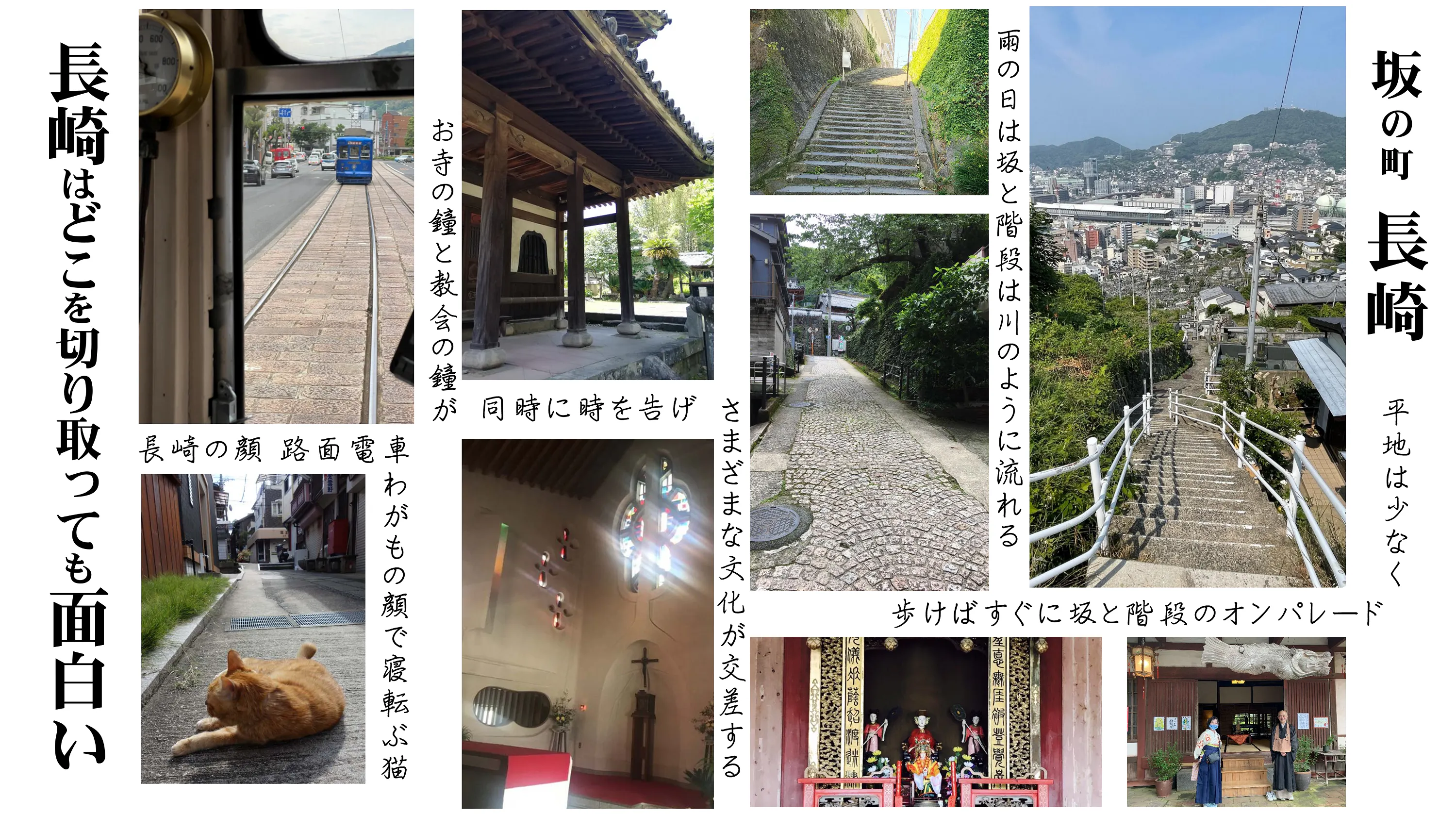 長崎には観光パンフレットでは紹介しきれない魅力がいっぱい。出島から日本中に伝わった「長崎発、日本初」を伝える文化・歴史・風景が、街中にあふれています。コンパクトな地形だからこそ、電車でぐるりとラクに見て回れます(どこまで乗っても140円、1日乗り放題の乗車券600円)見上げれば山、見下ろせば、段々上に家並みがギッシリ、まさに壮観です。港も海もすぐ近く。寺町通りを歩けば、時を告げるお寺の鐘と地域の教会の鐘が美しく響きあいます。坂道が多いけれど、さりげないやさしさの「白いペンキの石段(足元に気を付けての意)」が迎えてくれます。どこへ行っても「長崎らしい尾曲猫」たちが迎えてくれます。春夏秋風冬、暮らしの中に、食文化に、行事に、遥かな異国の文化が現在も色濃く息づいています。