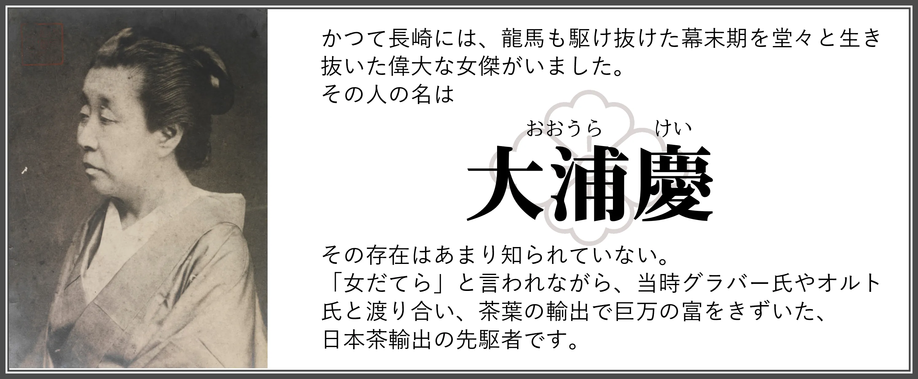 「大浦慶」私たちは彼女の壮大な夢、諦めることのない強い眼差し、生き方に強く惹かれました。