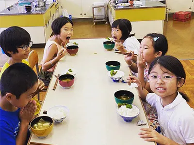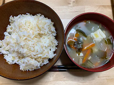 給食は、自然栽培のお米とみそ汁とお野菜の副菜1品程度でお肉はほとんど食べません。