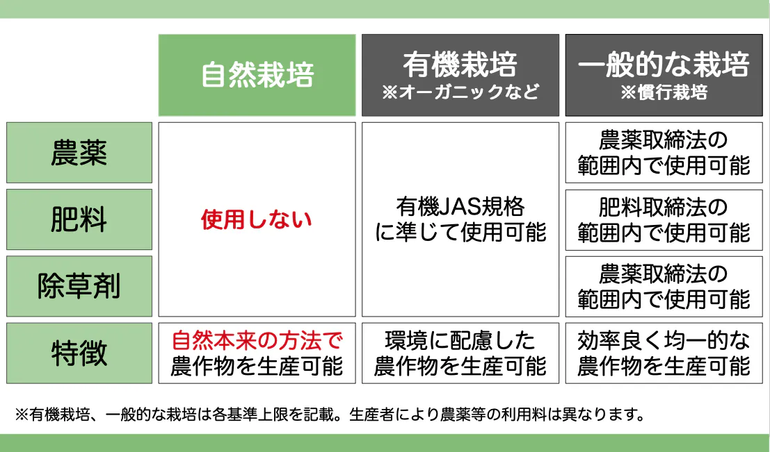 そして、有機栽培やオーガニックは、農薬や化学肥料など化学的なものが、土壌や人体に与える影響を減らそうと広がってきた農法ですが、 肥料を入れて栽培するという点で自然栽培とは大きく異なります。