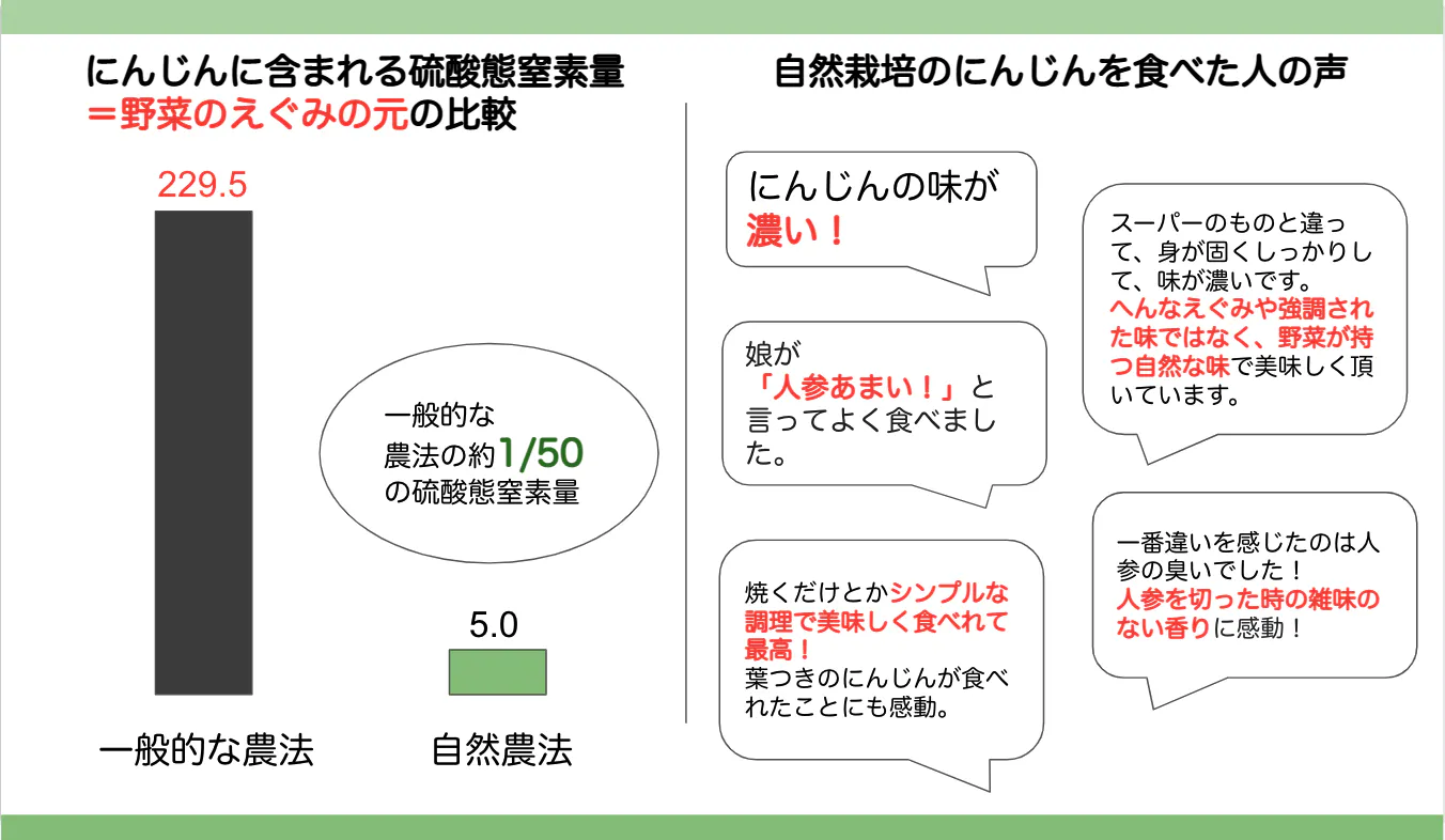 自然栽培の農作物は硝酸態窒素が少ないことで、すっきりした味わいや、お野菜本来の味を感じることができるのです。