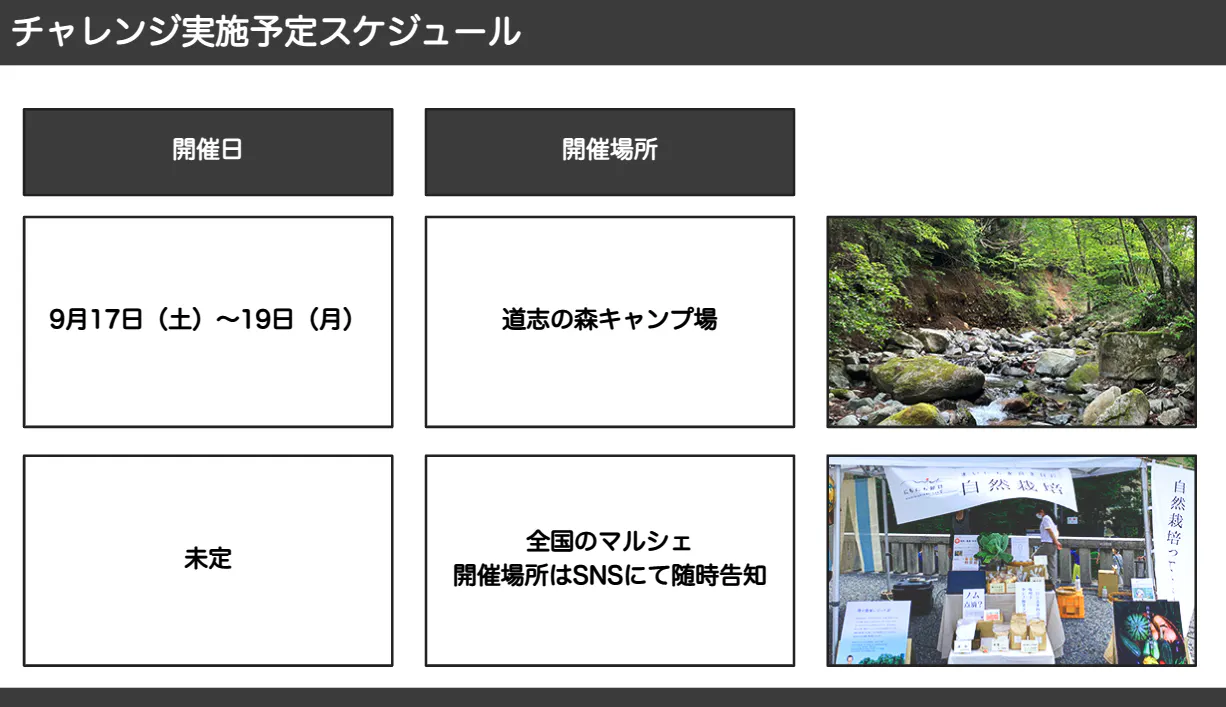 2022/10/16 21:249月17日〜18日に長野県戸隠キャンプ場にて1,000人チャレンジ第一弾のイベントを開催しました!■当日のブースの様子◎全体◎自然栽培クイズ◎野菜食べくらべ市販のきゅうり、トマトとの野菜食べくらべを実施。おいしい!と思う方にシールを貼っていただいたところ、、圧倒的大差をつけると思いきや!なんと接戦でした・・。実際に食べていただいた子ども達の中には、「スーパー(市販)のほうが美味しい」というストレートな感想もありました。親御様からは「味の濃い野菜(※1)が食べ慣れていないので、少し拒絶?してしまうかも」「子どもの頃からの食べるものが影響していると感じました。」と大変興味深いご意見もいただきました。改めて、幼い頃からの食生活によって味覚が形成され、影響が大きいことを感じました。(※1)自然栽培の野菜は、昔ながらの固定種を使用し、肥料を使わず、土壌のミネラル分を吸いながら、ゆっくり時間をかけて生長するので、品種本来の味が分かりやすい野菜が育ちます。◎お野菜パネルで記念撮影◎ピザ作り体験自然栽培米粉の生地に、トマト、ピーマン、タマネギ、なす、じゃがいも、チーズ・・たくさんの具材から好きなトッピングをして、オリジナルのピザ作り体験。自然栽培野菜を使った手作りのトマトソースとバジルソースも大好評でした!◎紙芝居だんまるさんによる紙芝居は子どもから大人まで大盛り上がりでした!今回のイベント向けに「食と命」をテーマにして、作成いただいたオリジナルストーリーは、紙芝居は見ていた全員が「いただきます」の意味を改めて考えられるとても印象的なお話でした。※紙芝居動画を含む返礼品へご支援いただいた皆様には、当日の録画映像の視聴用リンクを別途ご案内しますので今しばらくお待ちください。■戸隠キャンプ場様からのコメント今回のイベントで開催のご協力をいただきました戸隠キャンプ場武井様よりコメントを頂戴しておりますので、ご紹介させていただきます。◎イベントの反響 今回のイベントは多くのお客様にイベントを知っていただければと思い、早い段階で告知が始められました。お客様からも好評で、「楽しいイベントに参加できてよかった」「子供達が喜んでいた」など多くの声をいただきました。大規模なイベントの開催が難しい中ですが、今回のように小さなお子様でも楽しく、学びのある体験イベントを開催していただき戸隠キャンプ場としても大変貴重な機会をいただきました。◎主催者側の振り返り 宿泊のお客様を中心に多くのお客様にお越しいただきました。ピザ作りや、野菜の食べ比べ、紙芝居など家族で楽しめるイベントになったかと思います。キャンプ場以外でも今後このような取り組みを続けていただき、多くの方に美味しい野菜を届けてほしいです。 ◎今後のコラボの期待 今後もイベントなどは是非協力させていただきたいと思います。野菜やお米を使ったキャンプに合わせたレシピやメニュー開発などできれば楽しいですね。キャンプ=お肉やカロリーの高いものというイメージがありますが、野菜を中心のメニューや健康に目を向けたレシピなど今後期待できると思います。■今後の活動についてけんご君との1,000人チャレンジはまだまだ続きます!今後も定期開催のマルシェなどを通じてチャレンジを継続していきますので、にちにち好日のInstagramもぜひチェックしてみてください。https://www.instagram.com/nichi.nichi.kojitsu/■お詫びとご案内(返礼品の発送について)9月-10月にかけて予定しておりました、返礼品について畑の状況を含め、準備に時間を要しており発送時期が予定より遅れております。到着を楽しみにしていただいている皆様におかれましては申し訳ございませんが、到着まで今しばらくお待ちいただきますようお願いいたします。返礼品の発送予定時期は、明日、改めて、カテゴリ毎に、ご案内させていただきます。★★★★★ イベント動画まもなく公開予定 ★★★★★ もっと見る