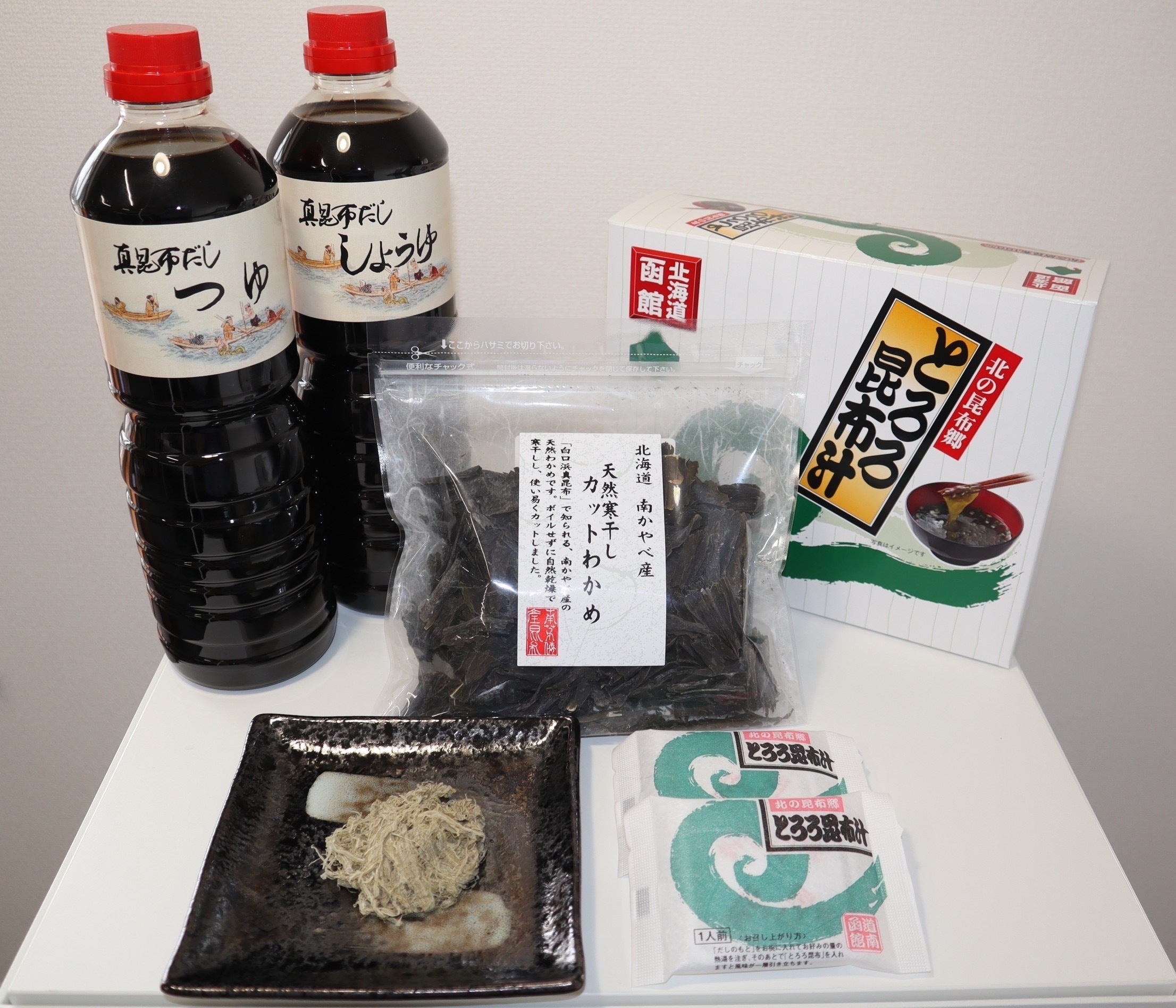 北海道産のとろろ昆布やわかめと、真昆布だしのセットです。