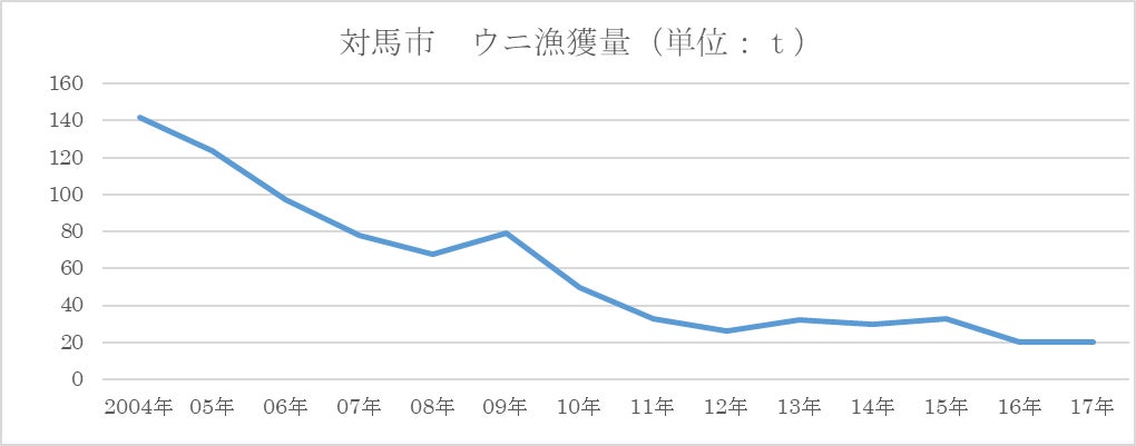 対馬島内のウニの漁獲量は磯焼けの進行と反比例するように減少しており、政府統計のポータルサイト「政府統計の総合窓口(e-Stat)」によると、統計が残るこの十数年間で7分の1以下に減少しています。一方、国内のウニの漁獲量もここ十数年で4割近く減少していますが、減少分をロシアやチリなどからの輸入で賄っており、国内の消費量としてはほぼ横ばいです。ただ、海外での日本食ブームで世界的にウニの需要が高く、近年日本への動きが鈍い状況もあり、今後輸入物の値上がりや輸入量の減少などが懸念されています。また、国内産のウニの漁獲量は減少していますが、1kg当たり卸売価格は、国内産の希少性もあり上昇傾向にあります。