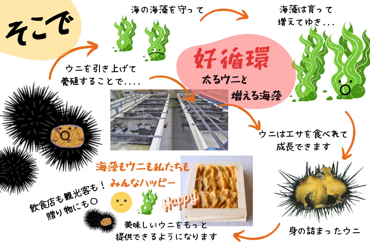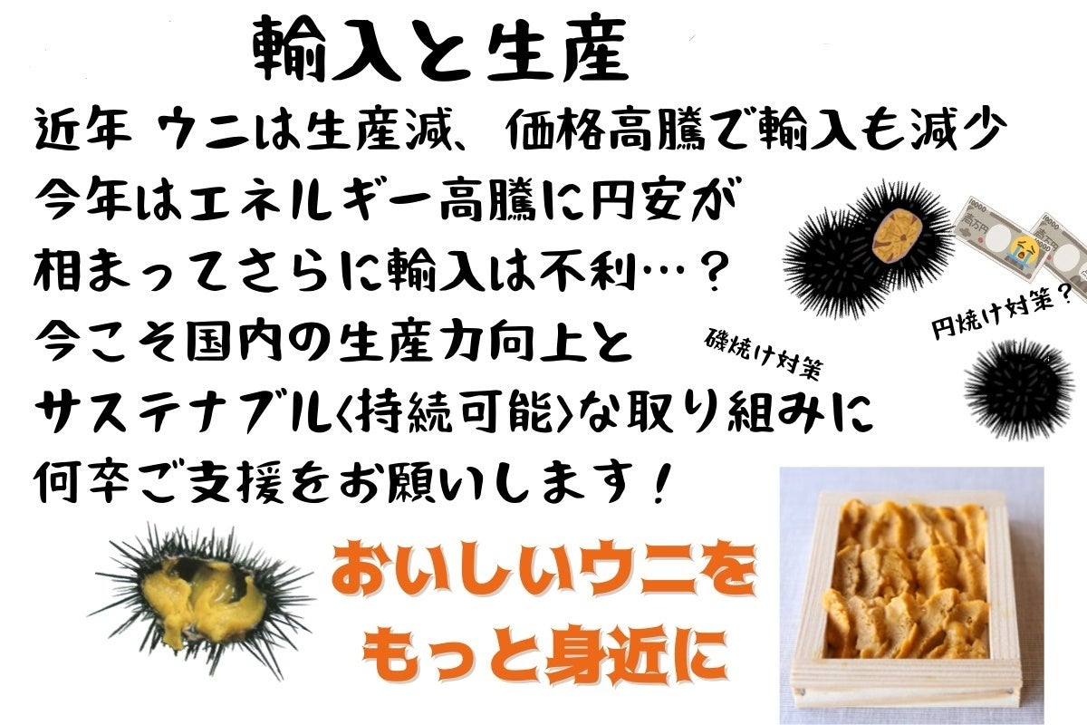 当社はこの現況を打破するために駆除ウニ及び身の入らない痩せウニを引き取り、品質が安定しやすい陸上蓄養を行なうことで、通年でおいしいウニを提供できる体制の確立を図り、販路はあっても原料がない状況を打開したいと考えています。