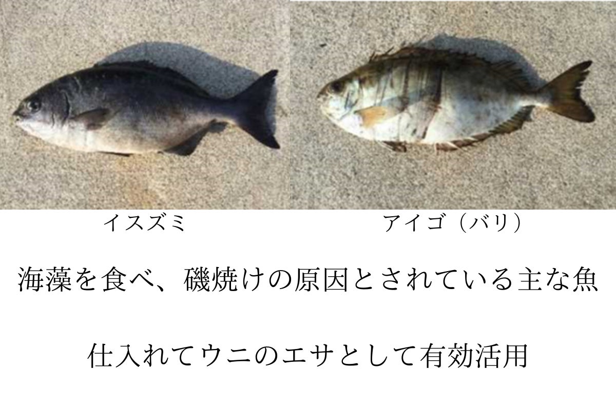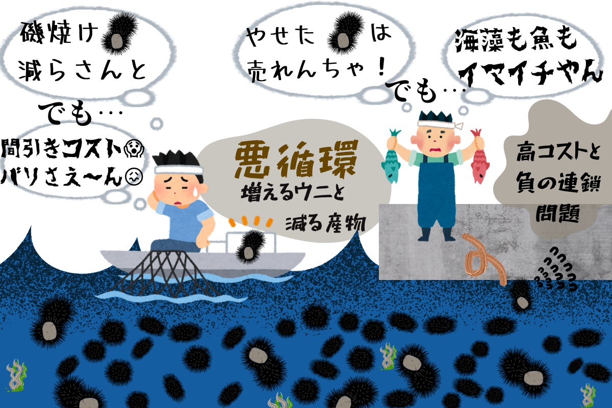 食害の原因となるムラサキウニ、ガンガゼなどのウニは、餌の海藻が乏しい環境でも生き残る強い生命力を持っているものの、餌が不十分だと日本人の好むウニ身が発達せず、売り物にはなりません。このため、ウニが過密になると、身の入らないウニが野放しにされ、海藻が芽生えてもすぐウニに食べられて磯焼けが続くという悪循環に陥っています。