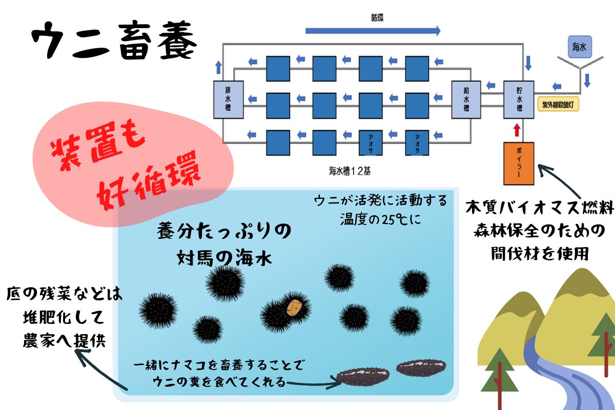 ウニを駆除し間引きをすることで適正規模のウニの個体数維持が可能となり、海藻の食害による磯焼けを防止し、対馬の豊かな海を取り戻すという所謂「海の森再生」にも寄与することができます。また、蓄養する駆除ウニを漁業者から購入することにより、漁業者の所得向上へ寄与することもできると考えてます。