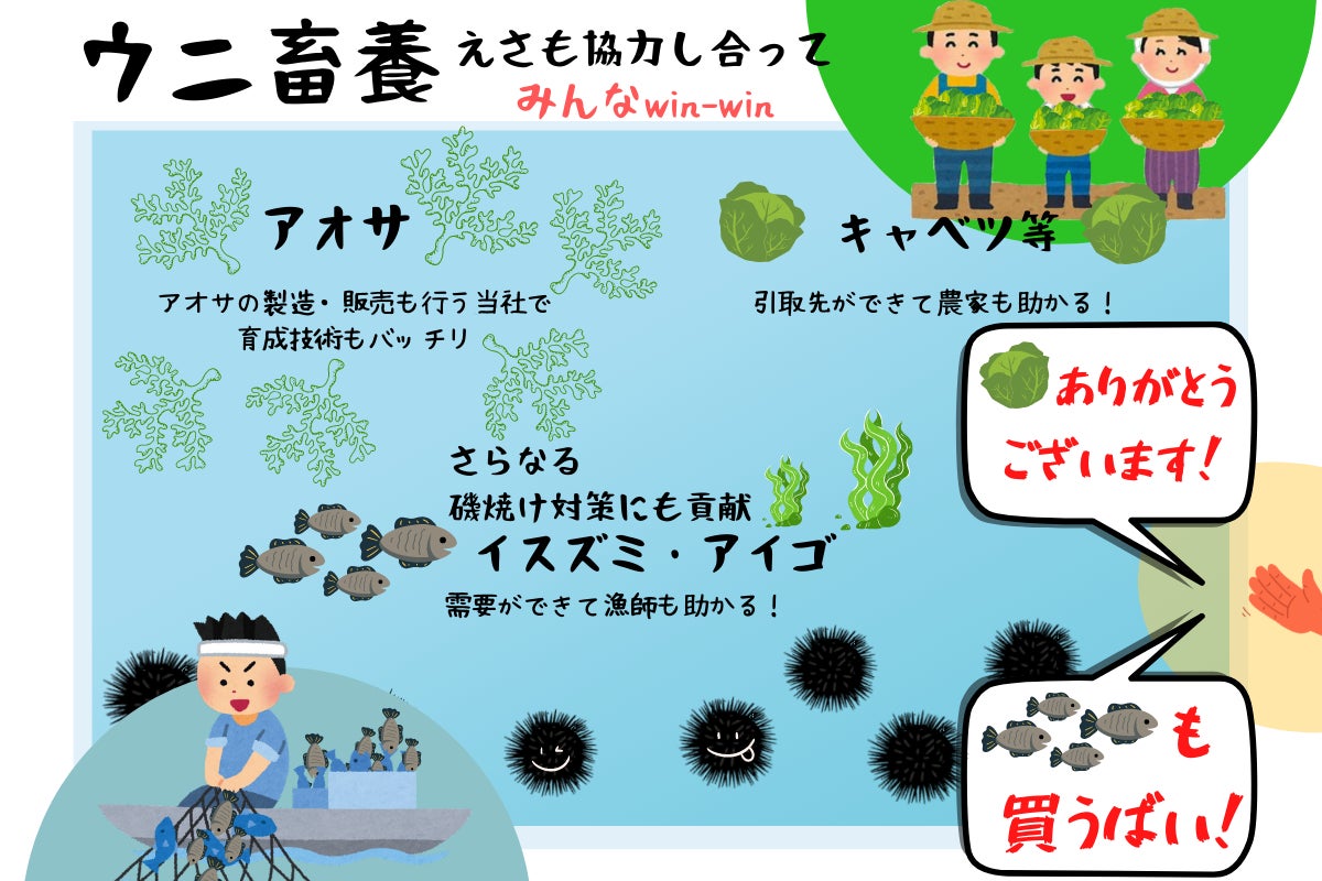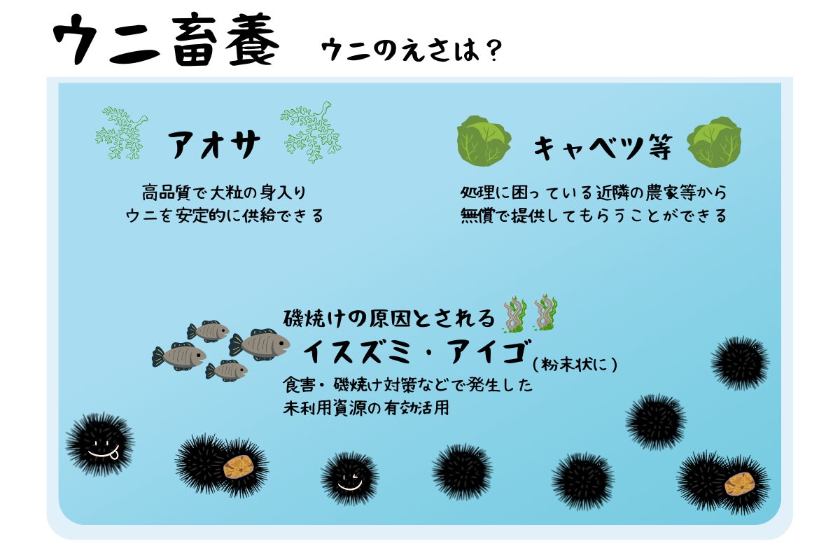 ウニのエサについては、12基設置した内2基の水槽で餌料海藻であるアオサの養殖を行ないます。アオサはウニの餌料としては適しており、種苗から育つまでの期間は約1週間と短期間で育成することが可能です。当社はアオサの製造・販売も行っているため、育成技術に関して懸念はありません。かつ、アオサを主原料とした贅沢な餌を与えることで、天然物と比較をしても甘みが強く、えぐみや苦味が少なく磯の香りが漂う高品質かつ個体差の少ない、大粒の身入りのウニを安定的に供給することができます。また、商品規格外のキャベツ等の葉もの野菜を与えることで身が引き締まったウニを蓄養することができ、低コスト化も図ることができます。キャベツについては近隣の農家等で処理に困っているという声があがっているため、無償で提供してもらうことができます。また、ウニは雑食であり何でも食べるので同じ磯焼けの原因とされているイスズミやアイゴもウニのエサとして活用することができるので、食害・磯焼け対策などで発生した未利用資源の有効活用も期待できます。仕入れた魚を当社で乾燥させ、粉末状にすることでウニのエサとすることができます。
