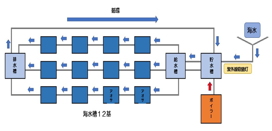 ①運んできた海水を貯水槽に貯め、バイオマスウッドボイラー(※効率性優先でセラミックヒーターに変更)で温める(ウニが活発に活動する温度は25℃)
