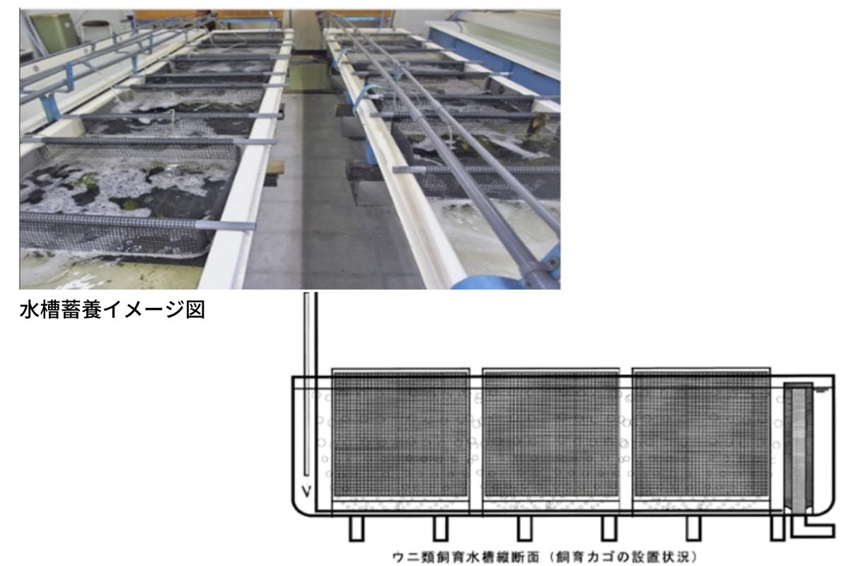なお、水槽の閉鎖循環方式のメリットとして、小規模施設でも取組が可能なこと、水温のコントロールができウニの成長促進が可能なこと、かけ流し式より排水コスト・環境負荷が少ないことなどがあげられます。さらに水槽下部にはナマコをあわせて蓄養することでウニの糞の除去が可能となり、水槽清掃などメンテナンスの負担軽減が可能になります。