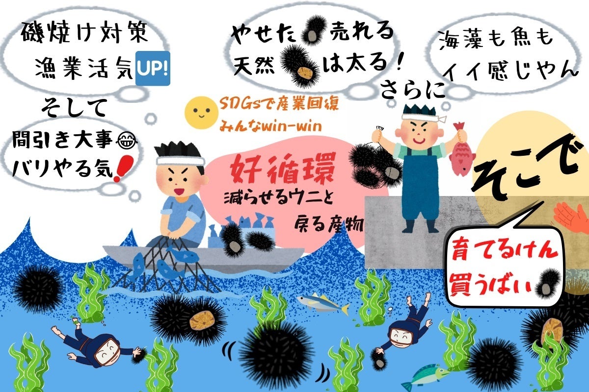このプロジェクトでは、これまで価値がないとされてきた磯焼けウニの潜在力を再発見し、新たなウニ蓄養産業として対馬で育成していくことができます。蓄養することで海藻の食害による磯焼けを防止し、対馬の豊かな海を取り戻す「海の森再生」に寄与する将来性があります。蓄養した生ウニをこれまであまりメニューになかった対馬の飲食店で提供することで、観光客等の来島者に対馬の特色ある海産物を堪能してもらい、対馬観光の「おもてなし」の一助となることも期待できます。このように漁業者や水産事業者・流通業者・飲食店・観光客等の消費者など、関わる全ての人がウィン・ウィンとなれるビジネスと環境保護モデルが構築できます。