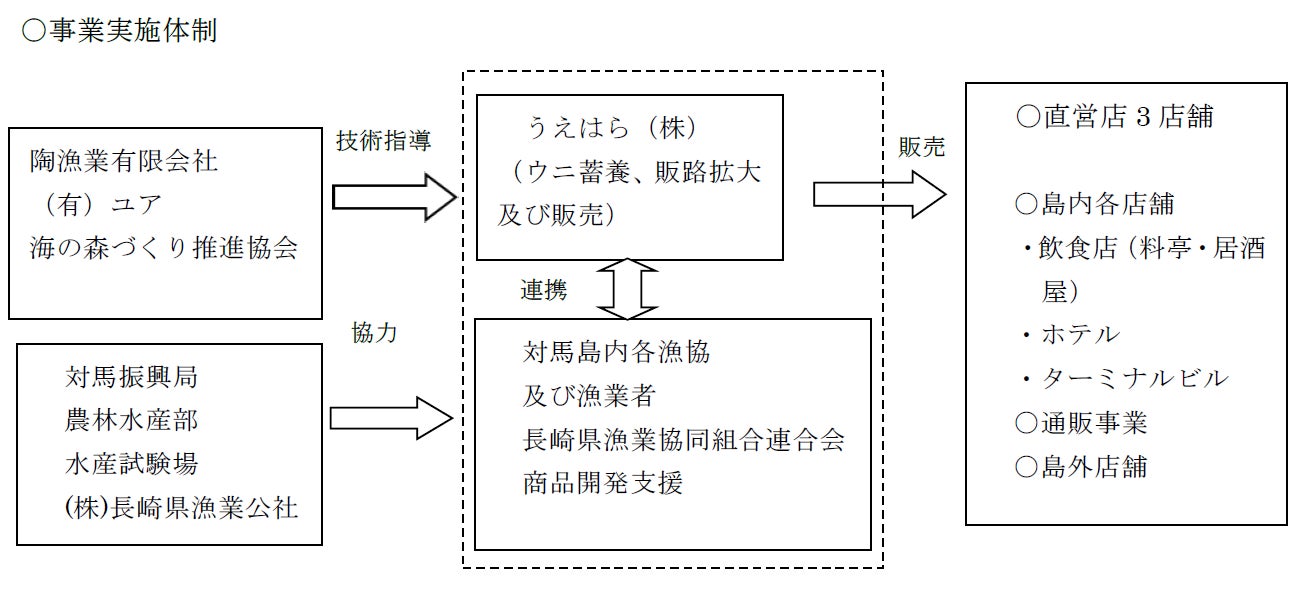 本プロジェクトでは、ウニの漁獲高の減少とともに販路があっても原料がなくなった「対馬産ウニ」の瓶詰め等の加工品の島外販路復活を図ると共に、磯焼け対策に向けての環境保全と持続可能な漁業に寄与する蓄養ウニの認知度向上とブランド化を図っていきます。海藻が消失する「磯焼け」の主要原因の一つとして上げられ駆除対象となっているウニを活用して、陸上養殖水槽で蓄養を行ないます。蓄養することで漁期や季節を旬の時期以外でも通年で飲食店等への生のウニの安定供給が可能となります。これまで対馬の飲食店では生のウニの提供はあまりされていませんでしたが、本事業を実施することで島外観光客等の来島者に対して対馬の特色ある海産物を堪能してもらい、対馬観光の「おもてなし」の一助となることが期待できます。