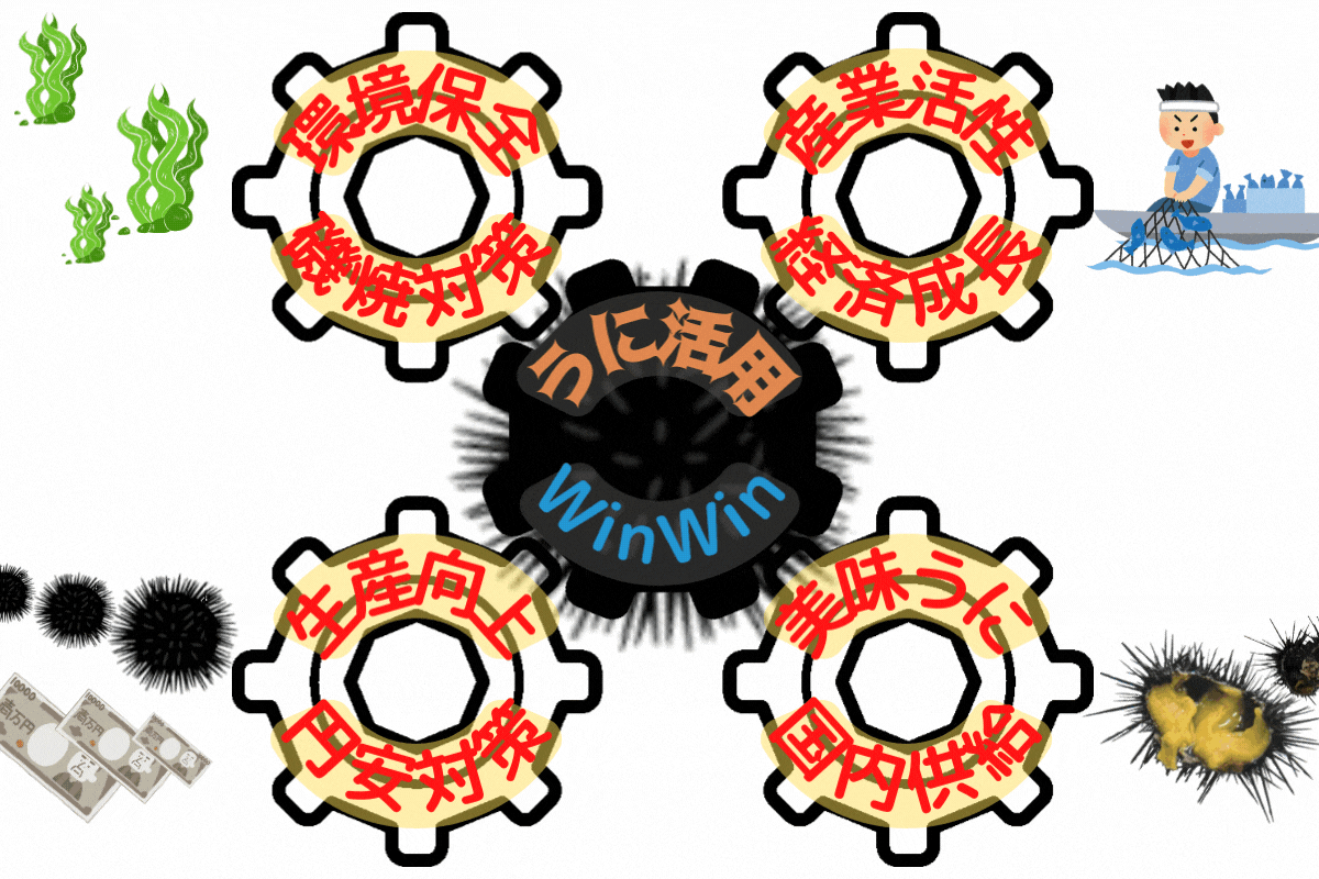 磯焼けによって、いくつもの歯車が嚙み合わず、あるいは離れたままうまく回らない状態でした…でもその間に「うに活用」という強い歯車を1つ加えることでそれぞれが噛み合い、干渉し合った全体がグルグルと動き出します。