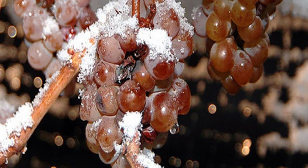 極寒の中、ブドウが氷結し、それを一気に収穫して搾ります。水分と果糖エキスの氷点が違うため、マイナス8〜15度で天然氷結したブドウは、果実の中の水分だけが凍り、果糖は凍りません。