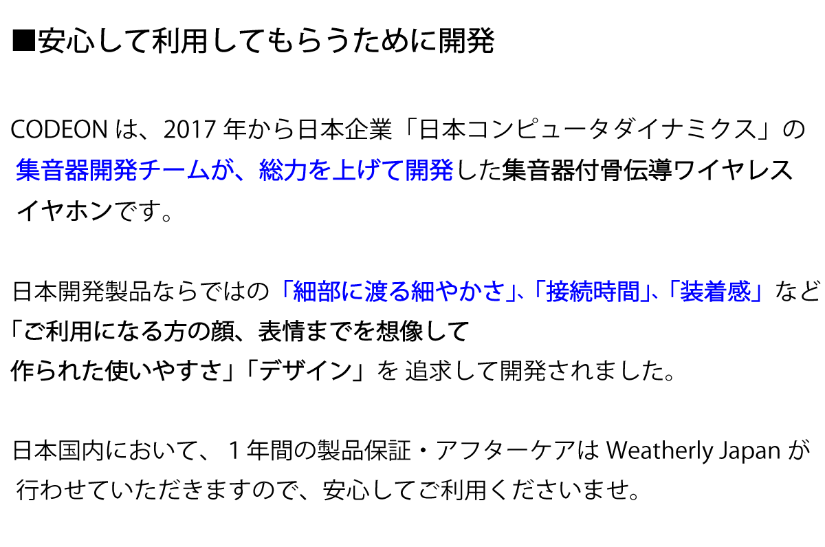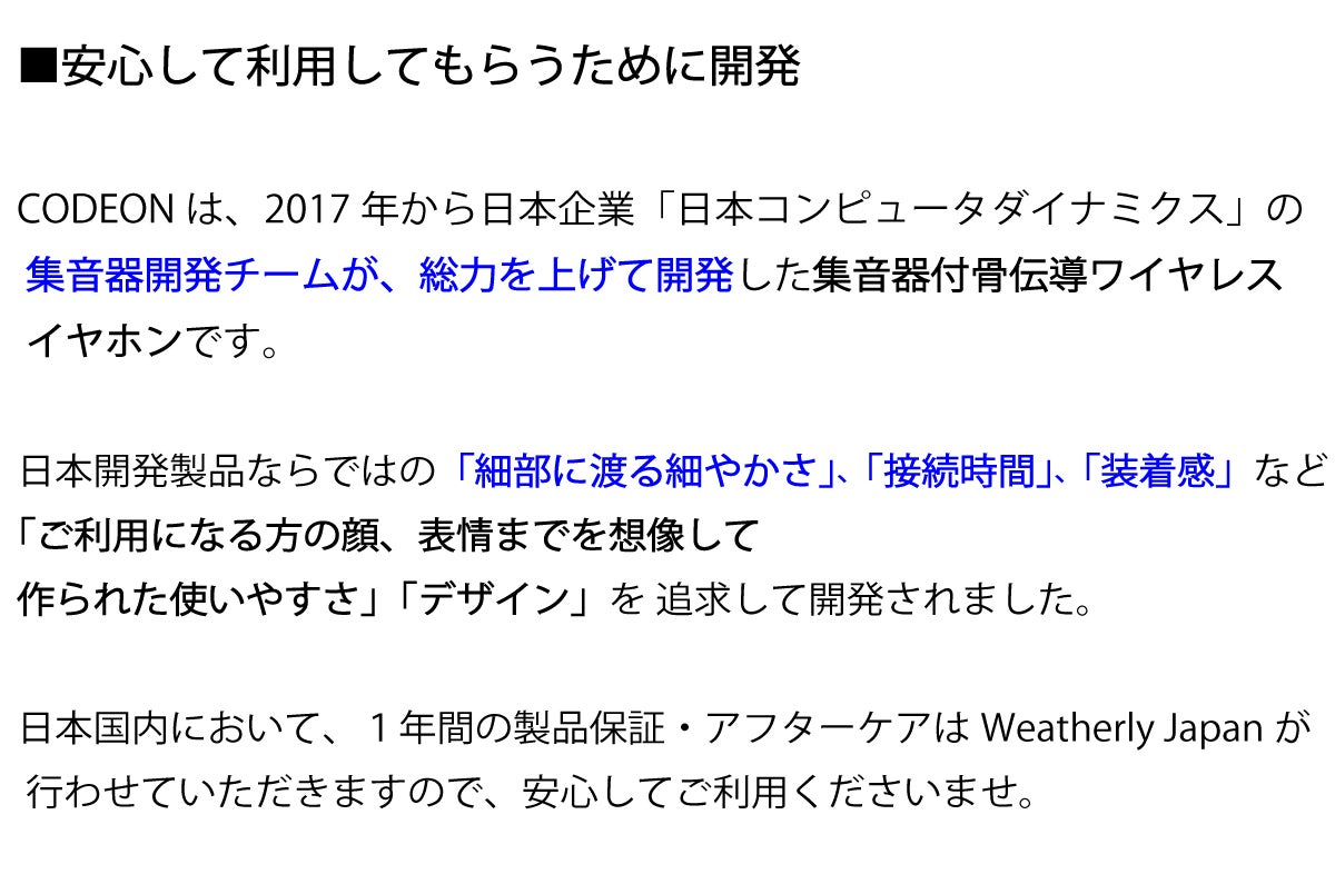 ※リターン品の配送が完了するまで、ウェザリー・ジャパン株式会社はCODEONの日本における独占販売権を有する正規代理店です。並行輸入品が発生する可能性がございますが、並行輸入品には正規代理店による製品サポートを受けることができません。また正規代理店を通じて購入することで、日本国内での流通に必要な各種認証の取得や、関税の適切な処理が担保されます。