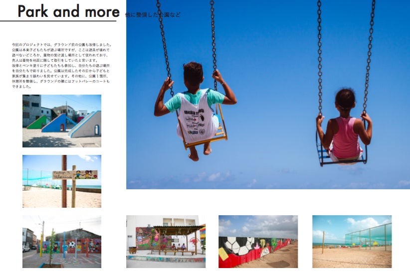 子どもと大人が協力し、サッカーグラウンドを改修したことに加え、その一帯の公園や休憩所も整備することができました。子どもたちが安心して遊べる様々な場所とともに、地域の大人たちが子どもたちを交通事故・薬物・犯罪の危険から守り育てていこうという意識に変化したことは、今後のグラウンドと町を支える大きな財産になっています。