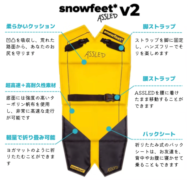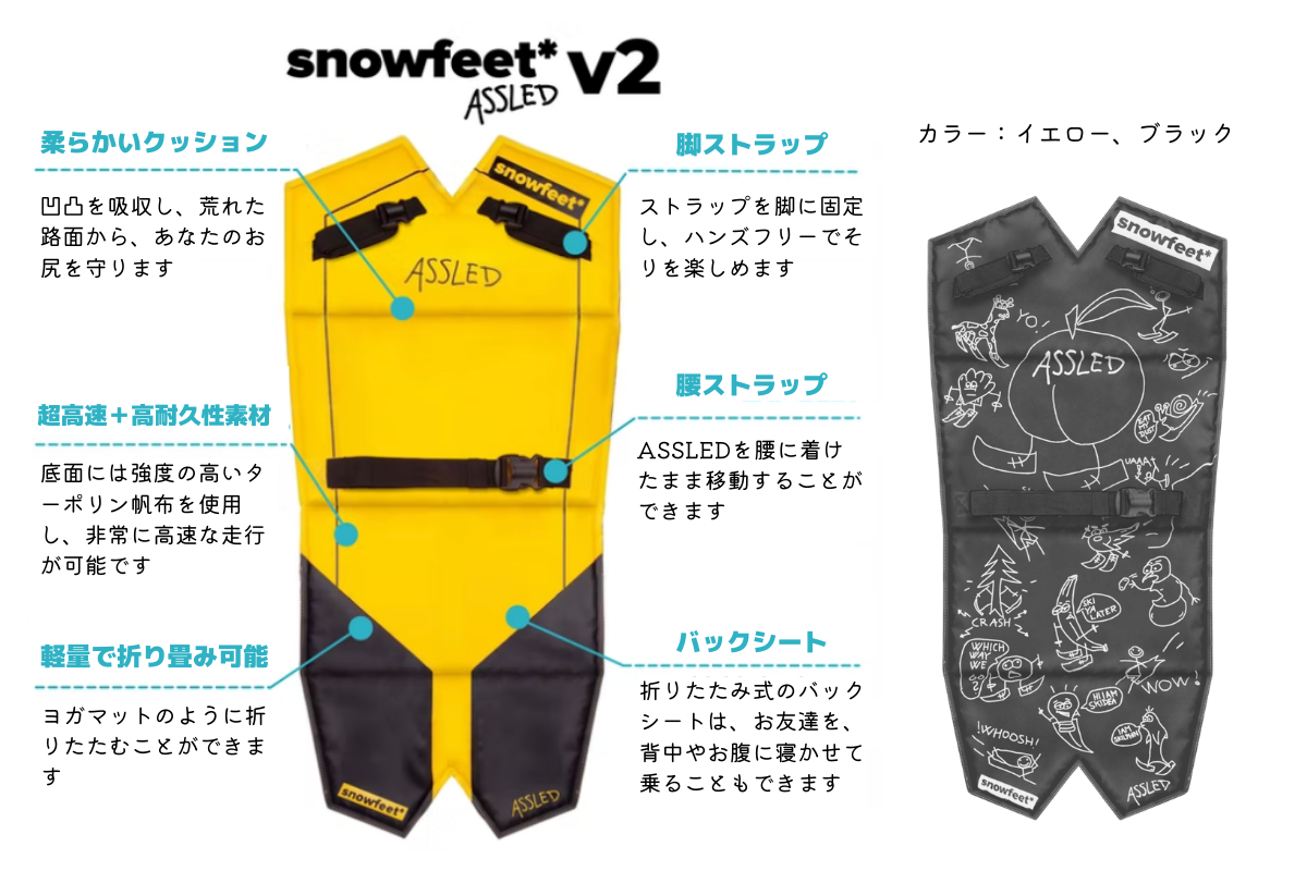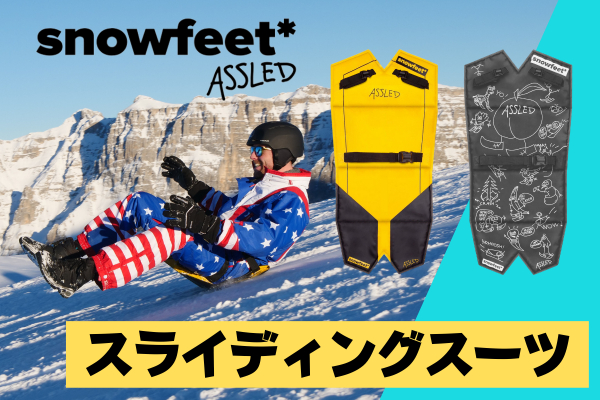 snowfeetとASSLEDをダブルで使用することで、こけそうになったらお尻で滑るということができるので、初心者なら転んでもお尻で滑れちゃう!上級者は新たなライディング方法として楽しめます。これで更なる雪山の楽しみを得ることができます!