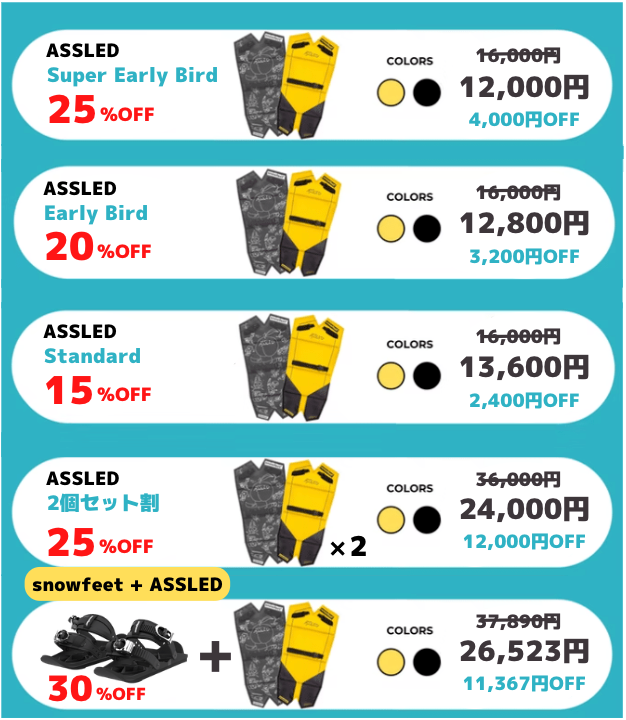 私たちは「ASSLED及びsnwofeet」を予定通りお届けできるよう迅速且つ丁寧に進めるよう最善の努力を尽くしますが、以下記載にあるような事情により止むを得ずお届けが遅れる場合があります。予めご了承ください。 本文中に記載させていただいたスケジュールは、あくまでプロジェクト公開時点の予定です。 クラウドファンディングの性質上、配送遅延の恐れがございます。原則として、配送遅延に伴う購入のキャンセルはできませんが、リターン配送予定月から4ヶ月を超えた場合には、希望に限りキャンセル対応させていただきます。 ・海外輸送中のトラブルや通関時のイレギュラー等で、お届け時期が遅れる場合があります。 ・仕様/デザインを変更させていただく可能性がございます。 ・並行輸入品が発生する可能性があります。個人輸入及び販路によっては防ぐことができない可能性がある点、ご了承願います。 ・購入者様都合によるキャンセルや返金はお受けできませんのでご了承くださいませ。 【ASSLED】を手に取ったお客様に楽しいウィンターシーズンの思い出が提供できるようにチーム一同頑張って参りますので何卒宜しくお願いいたします。