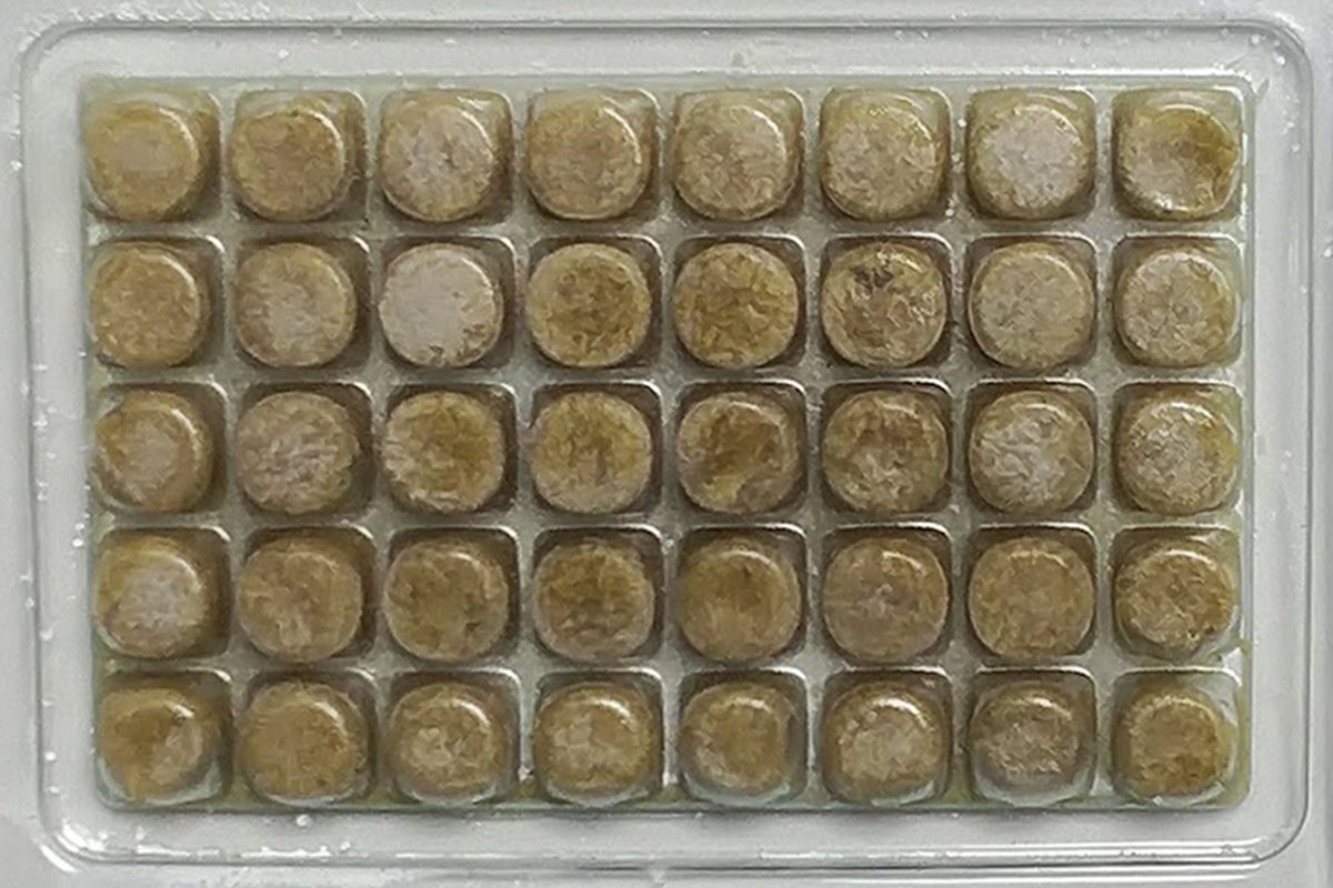 緑色植物プランクトンと、グリーンウォーターをつくる発酵済み栄養素をワンパッケージ化するため冷凍タブレットのカタチにしました。