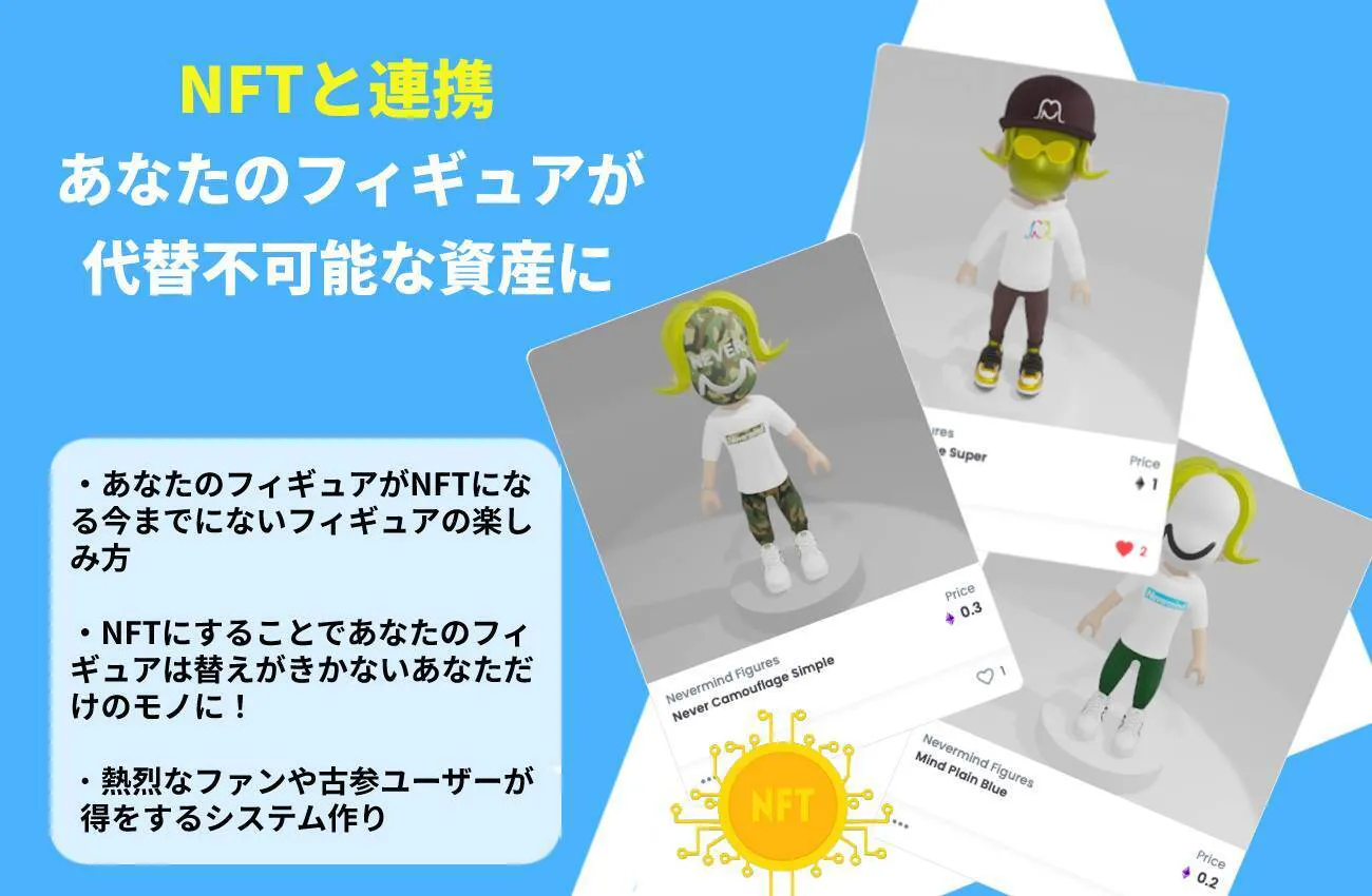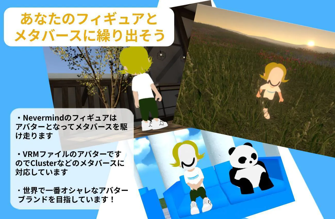 Nevermindはメタバース時代の新しいフィギュアとしてアバターとしてメタバースに繰り出すことができるなどこれまでとは全く違うフィギュアの楽しみ方を提供します。