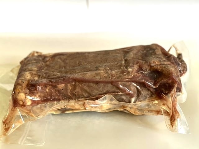 焼き上がった物を一晩冷蔵庫で冷やし、真空包装後コンベクションオーブンにて、