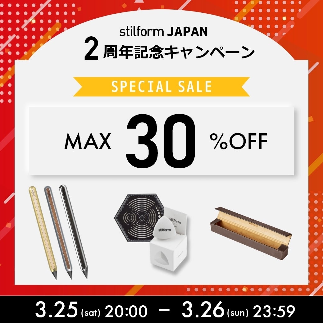 2023/03/25 12:00平素より、stilformをご愛顧いただき誠にありがとうございます。ドイツ筆記具「stilform 」は、2020年9月にクラウドファンディングキャンペーンをもって日本に初上陸をし、2021年3月からはstilform JAPAN 公式ストアでの販売を開始いたしました。2023年現在は、3万名を超えるお客様にご愛顧いただいております。公式LINEのみでも文房具メーカーのなかでは非常に多くのお客様「12,000名」以上のお客様にお友だち追加をいただいております。日頃の感謝を込め、2周年記念セールを開催いたします。_______________________【stilform JAPAN 公式ストア 2周年記念セール】 3月25日㈯ 20時00分 スタート ※モデルによって、割引率、在庫数等が異なります。https://stilformjapan.com/collections/all-products_______________________ぜひこの機会に、セール会場をチェックしてみてください。セール開始通知を受け取るhttps://lin.ee/BaNjbt2stilform JAPAN もっと見るお届け情報(2月7日更新)