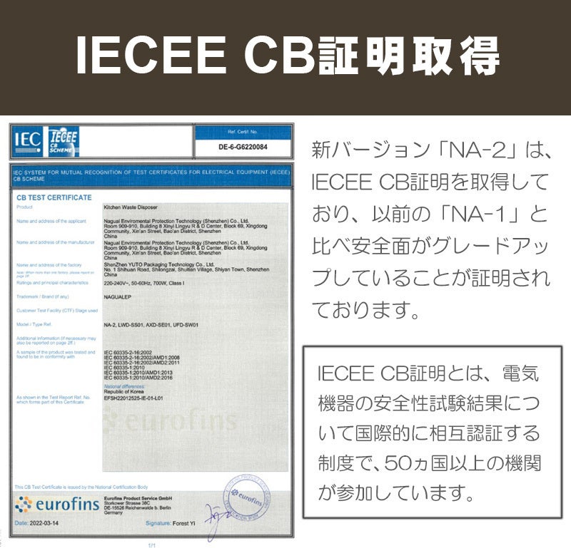 従来品(NA-1)だとフィルターを1つつけるにも一苦労しましたが、新バージョン(NA-2) は片手で楽々簡単にフィルター交換が出来ます!さらに、「IECEE CB証明」も取得しているので安全面でもパワーアップ!