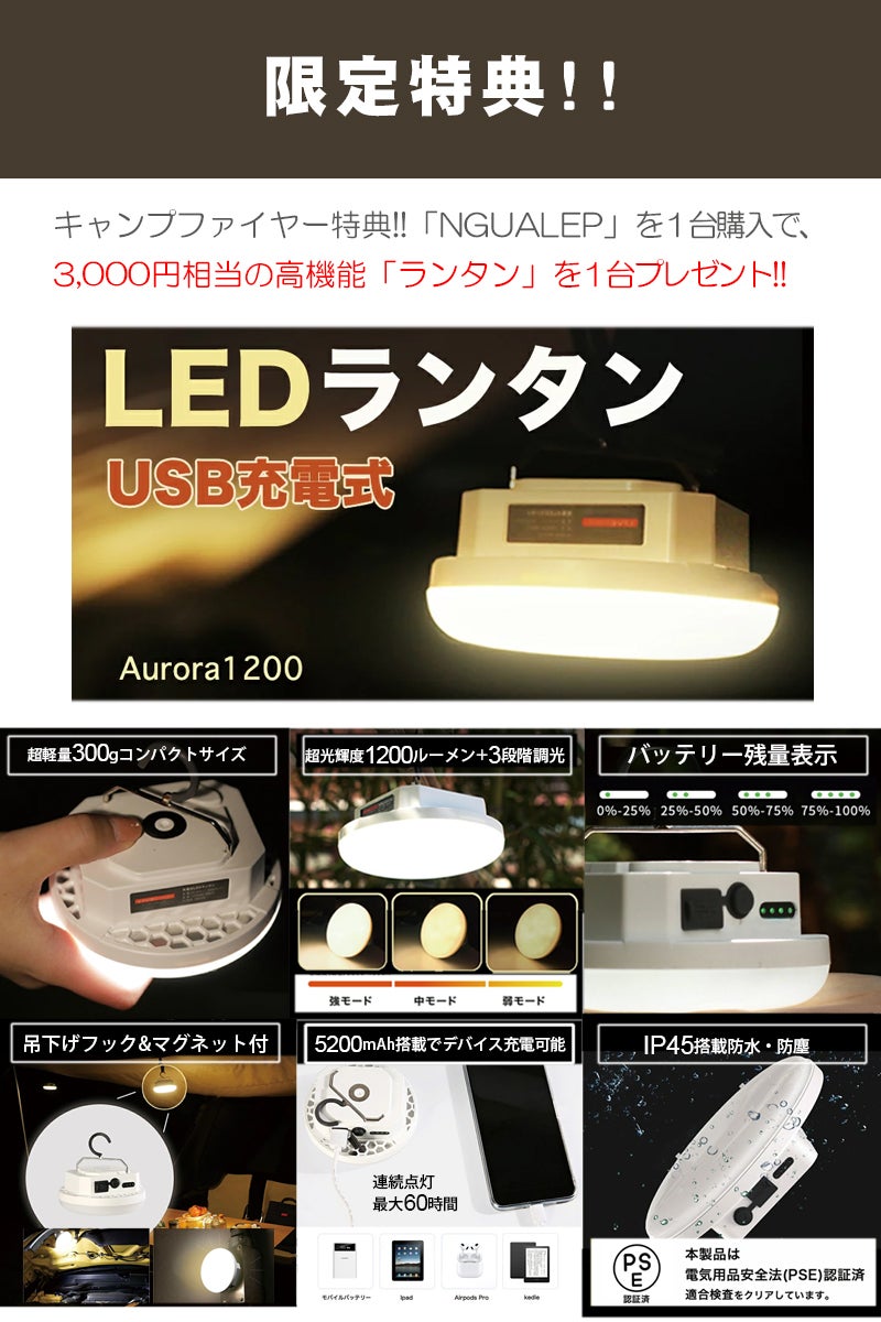 「【キャンプ】 ファイヤー」だけに【キャンプ】 にかけて(〃ノдノ)テレ 、キャンプグッズを「NGUALEP」1台購入毎に「高機能コンパクトランタン」をプレゼント!!