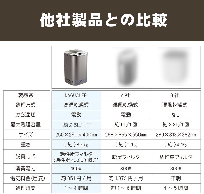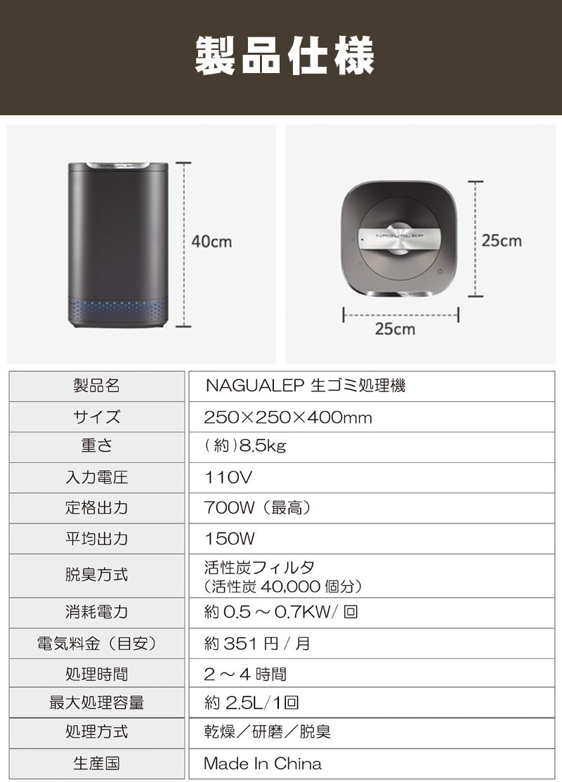 NAGUALEPは生ゴミを乾燥処理し大幅に減量!場所もとらず嫌な臭いもしないのでゴミを出し忘れても問題ありませんので、ストレスを感じることもございません!