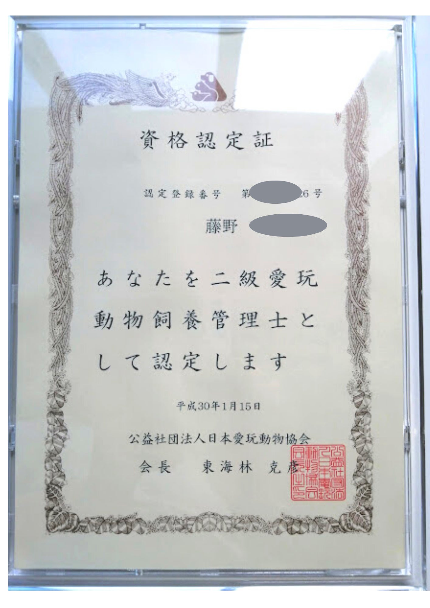 第一種動物取扱業登録証登録 千葉県第18-5-2号 展示業登録年月日 平成30年5月14日有効期限 令和 5年5月13日