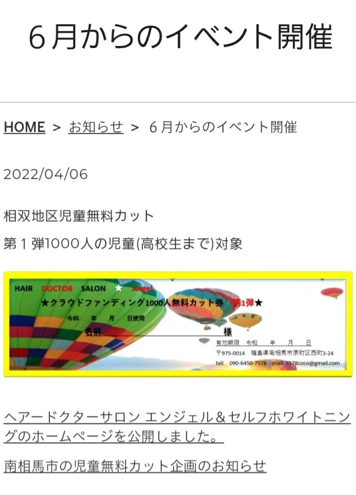 2022/09/05 20:14皆様、温かい御支援ありがとうございましたちびっこ応援隊!第2段1月より南相馬市児童無料カットを致します。温かい御支援ありがとうございました引き続き新しいプロジェクトを考えています御支援よろしくお願いいたします(*^^*) もっと見る
