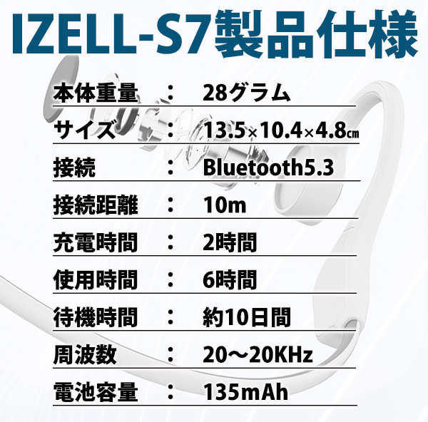IZELL-S7は本体重量28gながら一度の充電で約6時間使用する事が可能です。