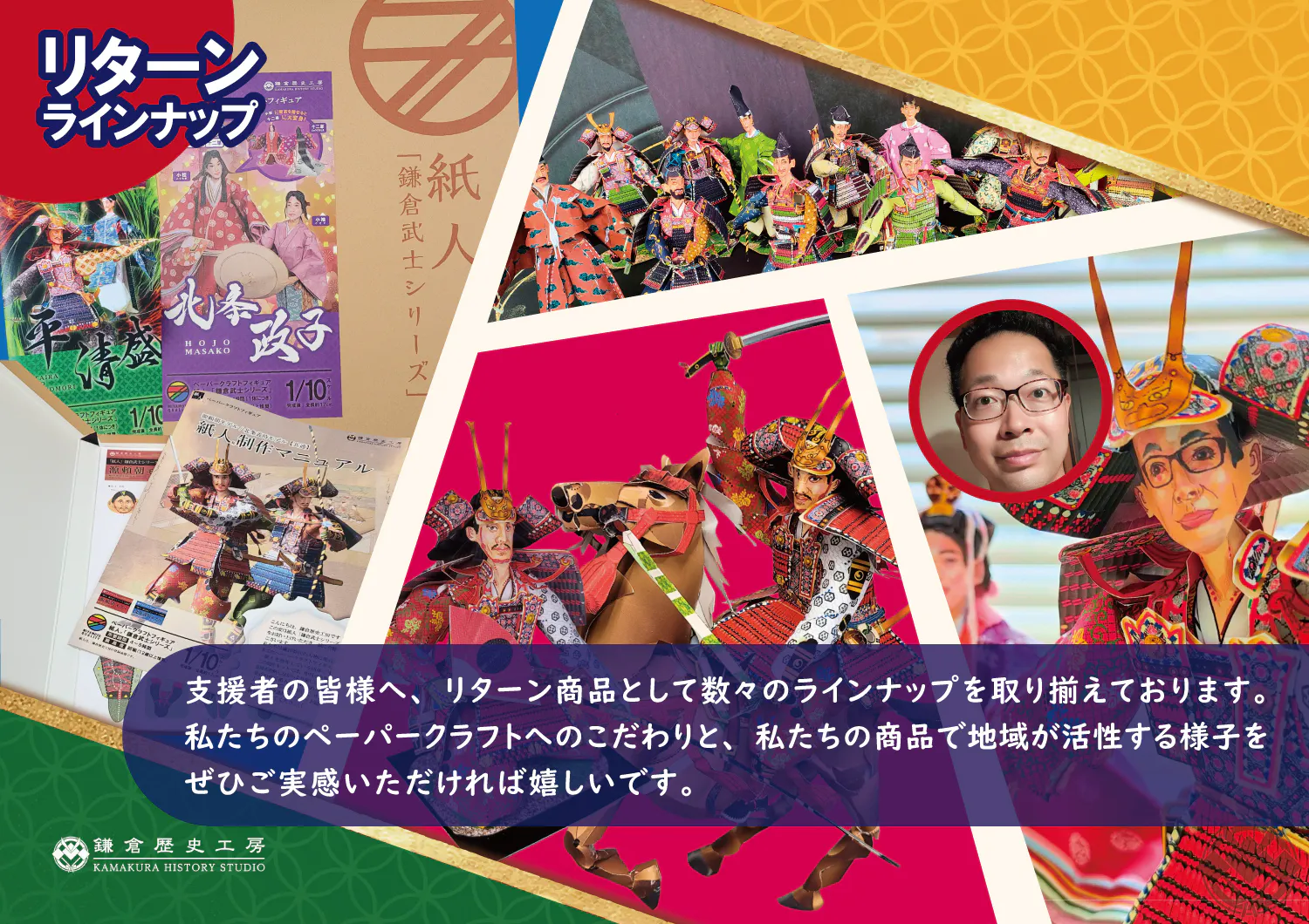 こんにちは!私たちは『鎌倉歴史工房』といいます。鎌倉武士をモチーフにしたペーパークラフトフィギュア「紙人(かみひと)」の制作・販売を手掛けている団体です。2019年10月鎌倉市御成町にオープンしました(※2021年1月より横浜市に移転)。紙人を皆様にお届けするにあたり、いくつかのこだわりがあります。環境への負担が極力少なくなるよう全て紙で作る事にこだわり、特許を取得しているカッティング技術によって類を見ない可動域の多様性を実現した事に加え、参考文献や実際の甲冑からデザインを落とし込み再現性の高さにもこだわっています。美術品のようなクオリティながら、手軽に遊べて手軽に飾れるの事をこの紙人で表現し、日本国内のみならず全世界へその感動と魅力を伝えていきたいと考えています。 団体紹介<https://kamakura-hs.com/concept>