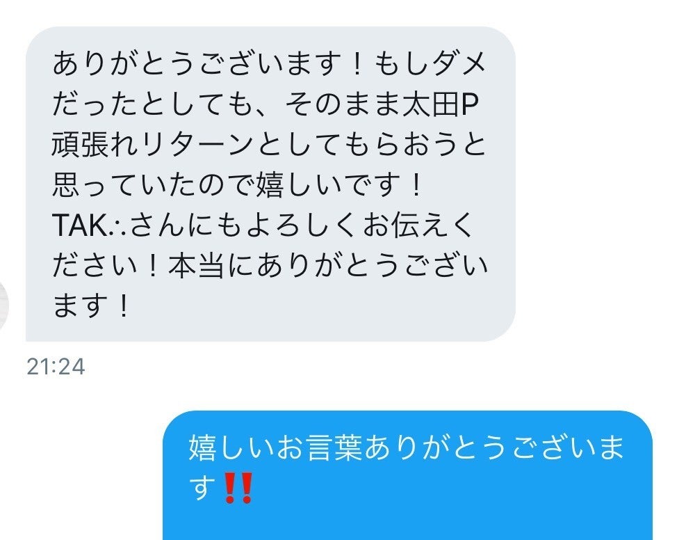 お客様にその旨を報告すると、もしダメだったとしても、そのまま太田P頑張れリターンとしてもらおうと思っていたので嬉しいです!TAK∴さんにもよろしくお伝えください!本当にありがとうございます!と返事がきました。