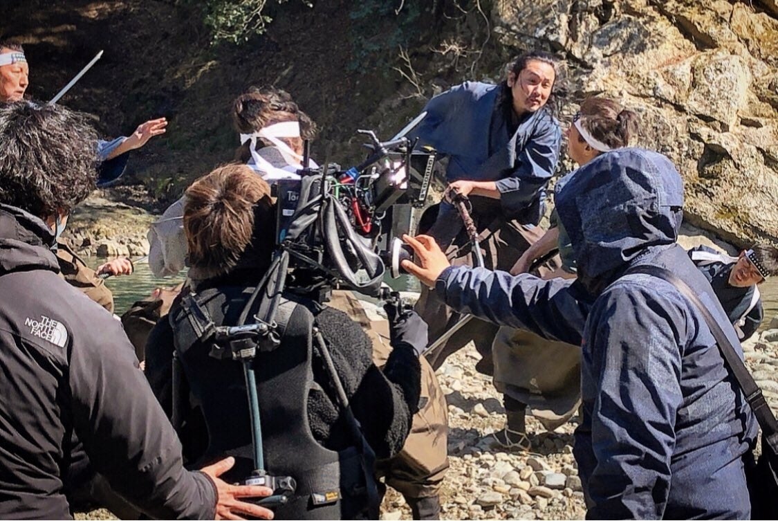 拓氏のキレある動き。相手役も素晴らしく。その動きを撮らえる撮影者長野泰隆。それを支える撮影部の優しい右手。その背後には支援者が見守る現場。添えられた沢山の右手により狂武蔵は完成に近づいています。