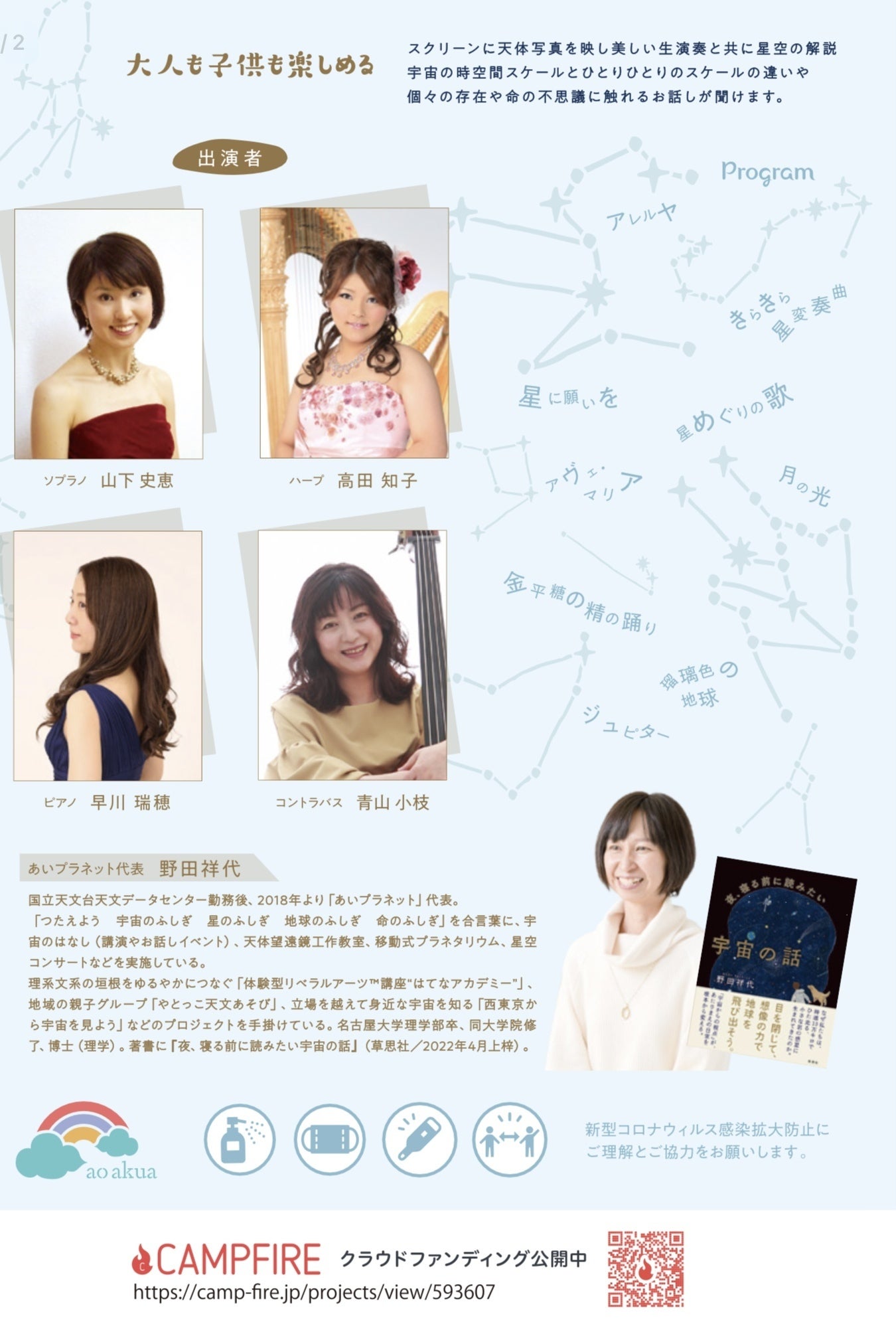 多くの方からご質問をいただいております。「曲って何やるの?」はい、申し訳ございません、未発表でしたm(_ _)m。最新のチラシ裏面に星座の様に散りばめてあります。【ジュピター】や【瑠璃色の地球】、星といえば【キラキラ星変奏曲】など。乞うご期待♡私、青山が大好きなシューベルトの【アヴェ・マリア】もコントラバスソロでお届けします。