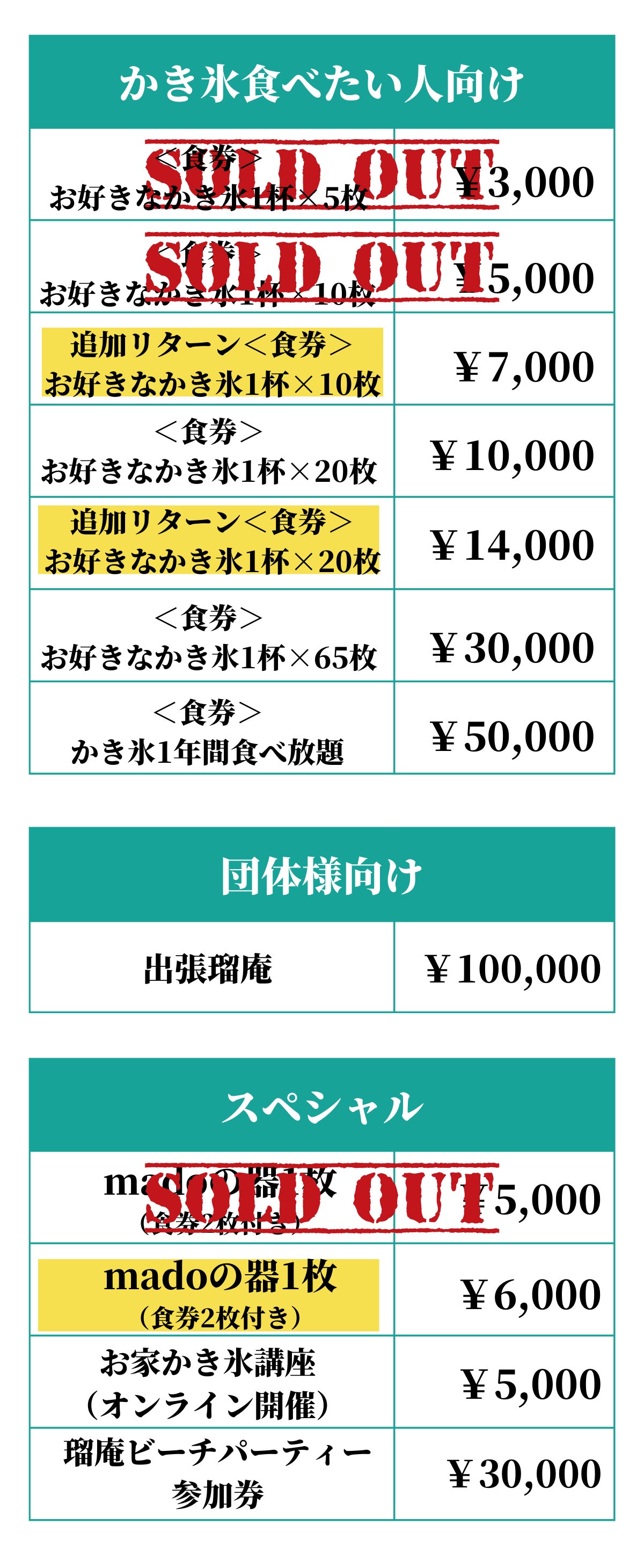 瑠庵ファンや団体様向けなど、一人でも多くの方に瑠庵のかき氷を届けきれるようなリターンをご用意しました!一部売り切れがありましたので新しいメニューを貼っております。詳細は下記↓↓