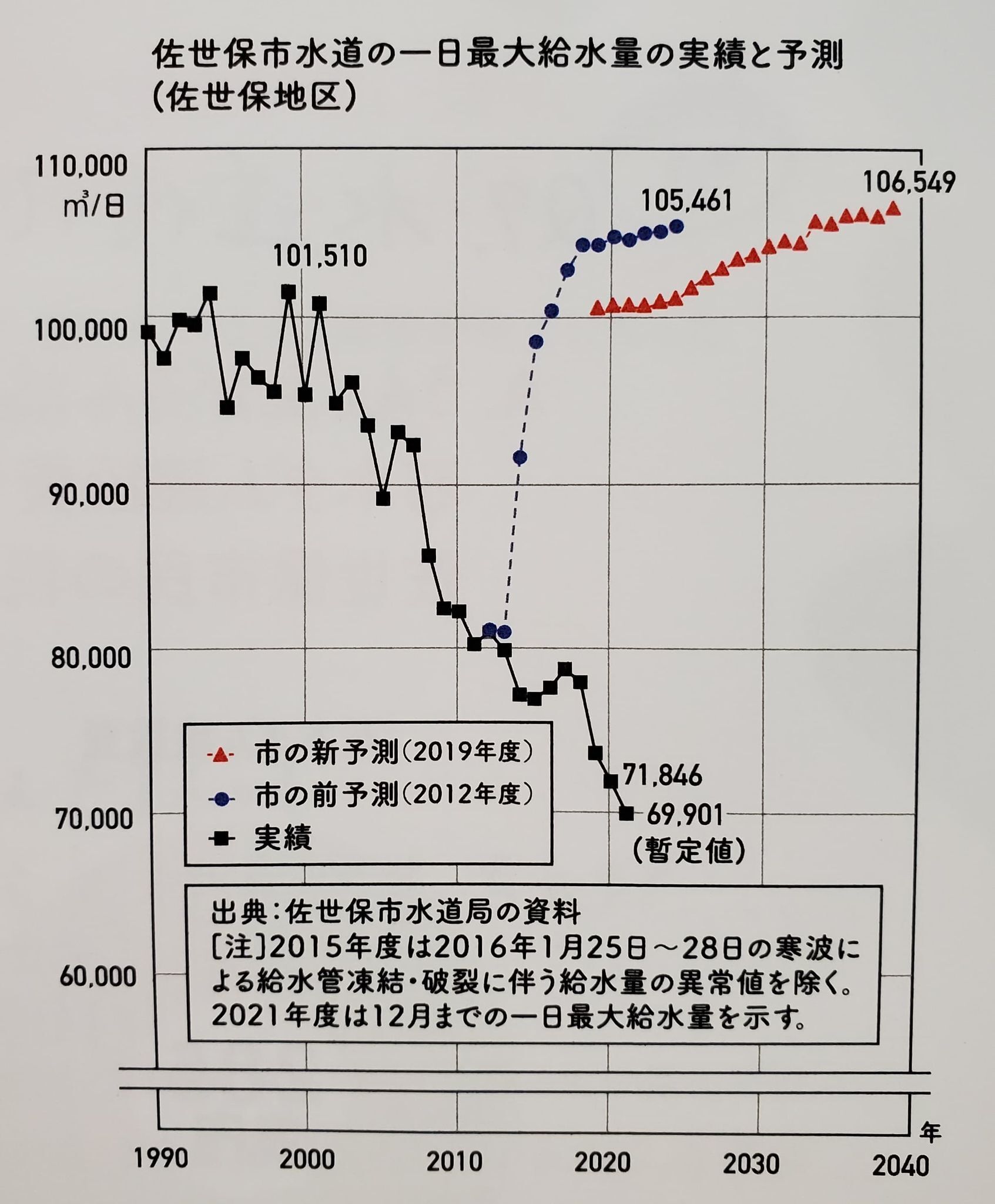 黒い折れ線が実績、青と赤の線が佐世保市が