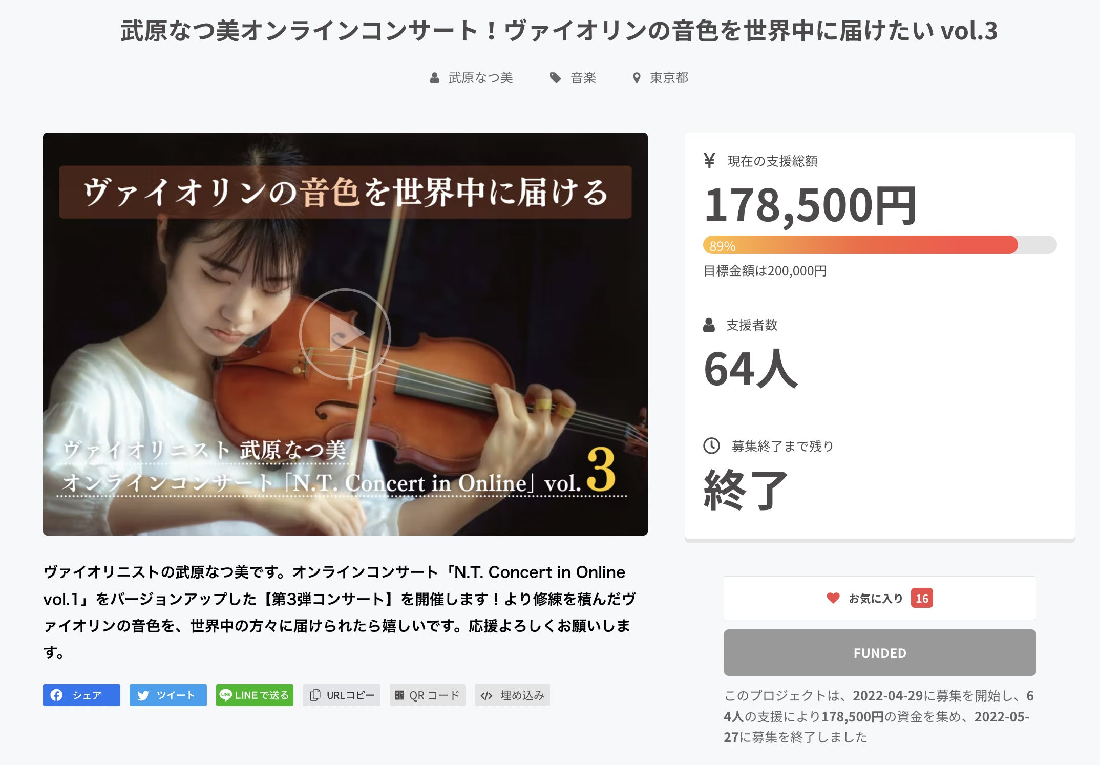 2022/07/03 07:00おはようございます♬オンラインコンサート無事終了いたしました♫ご視聴してくださった皆さま。本当に本当にありがとうございます!!ここでは、今回の反省と感想を書きたいと思います!※先ほど、想いを書いた文章がすべて消えてショックを受けながらもう一度書いております(´;ω;`)今回のコンサートが終了して、感じた気持ちは反省と後悔でした。もっと準備しておけばよかった。スタッフと綿密に打ち合わせすべきだった。先を予測して動くべきだった。ちゃんとリハーサルする時間を確保すべきだった。という気持ちがぐるぐるして眠れませんでした。今回はたくさん新しい挑戦をさせていただいたので、気づきがとても多かったです。一番難しかったのは、音源と演奏する難しさでした。イヤホンで聴きながらの演奏は、自分の本来のヴァイオリンの音が聴こえず、本当に出したい音が出せず悔しい気持ちでいっぱいでした。。そして、音源よりも生の楽器との演奏の楽しさを改めて実感しました。今回は、予算の関係で音源との合わせでしたが、これからは生のセッションを楽しんでいこうと決めました。また、アンコールにクラシック音楽を演奏したとき、あぁ。やっぱりクラシック音楽が好きだ。と心から思いました。クラシック音楽を演奏してる自分のほうが、緊張して、音楽とちゃんと向き合って、なによりワクワクしていることに気が付きました。なので、私はクラシック音楽をこれから勉強していきたいと思ったし、もっともっとその音楽を伝えていきたいという気持ちが強くなりました。私は、やってみないと気付けない人間みたいで、、、今回このような経験ができる機会を与えてくださって本当にありがとうございます。これからも七転び八起きしていきたいなとおもいます。そして、、N.T.Concertは、ついに最終回を迎えます!!最後は、コンサートホールで演奏して、是非生の音を聴いていただけたら嬉しいなと思っております。【日程】8月12日開演18:00(開場17:30)【場所】かつしかシンフォニーヒルズ アイリスホールまた、Facebookで配信もいたしますので、楽しんでいただけたら嬉しいです。最後のコンサートでは、絶対後悔しないように全力で今できる武原なつ美のコンサートを表現できたらと思っております!!!!すべて自分で決めるコンサートなんてなかなか経験できることではないと察して、このチャンスを絶対に活かすために、自分の表現したいものをすべてぶつけてみたいと思います!!!その覚悟を決めるために、髪をばっさり切っちゃいました!全力のタケハラナツミをどうか見届けていただけたら嬉しいです。8月12日のクラウドファンディングは、7月6日開始予定です。これからも音楽を奏で続けます。武原なつ美 もっと見る【本日20:00より、コンサートがスターといたします♫】
