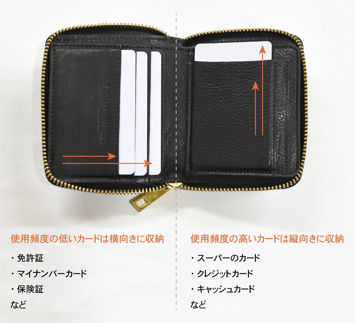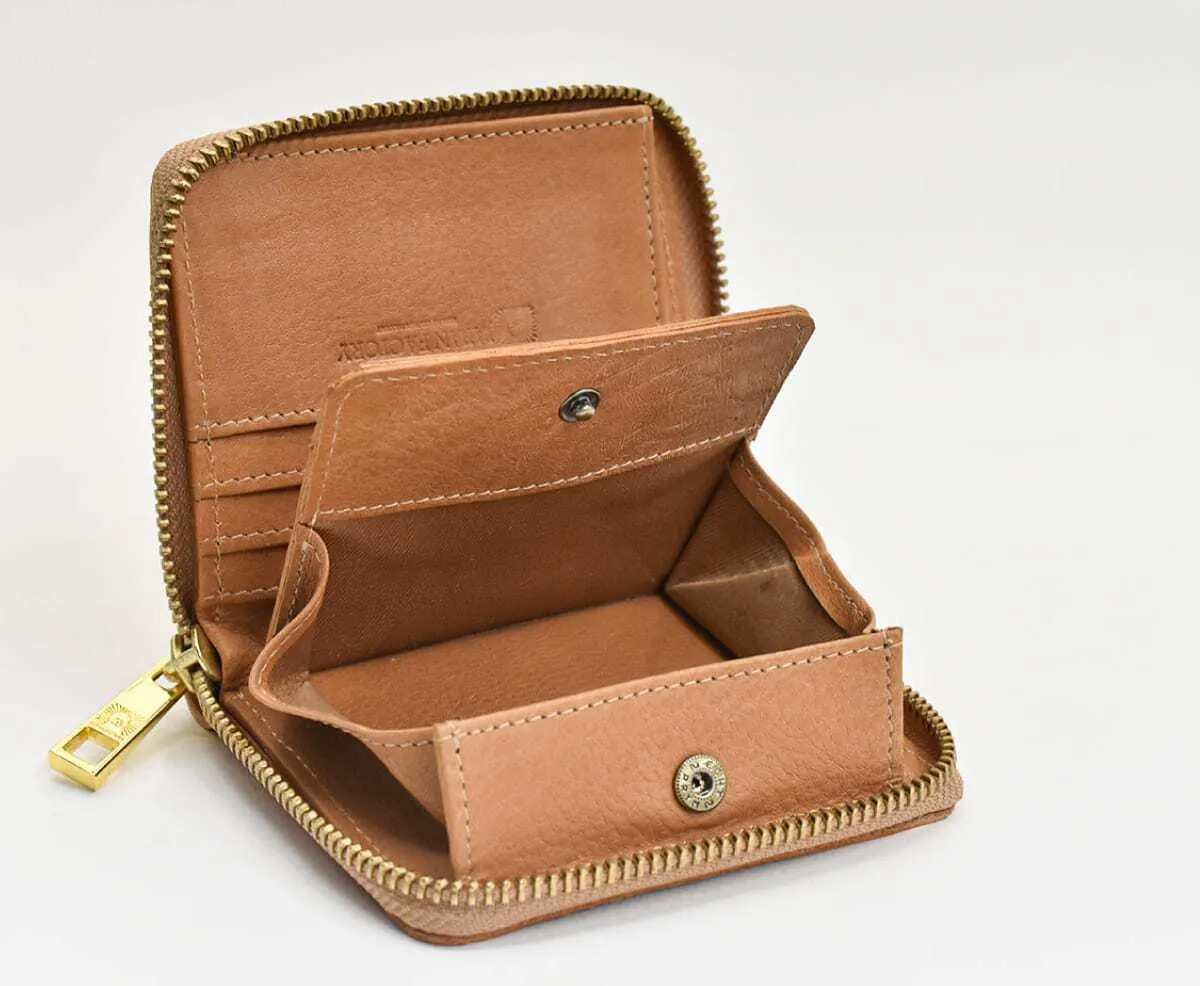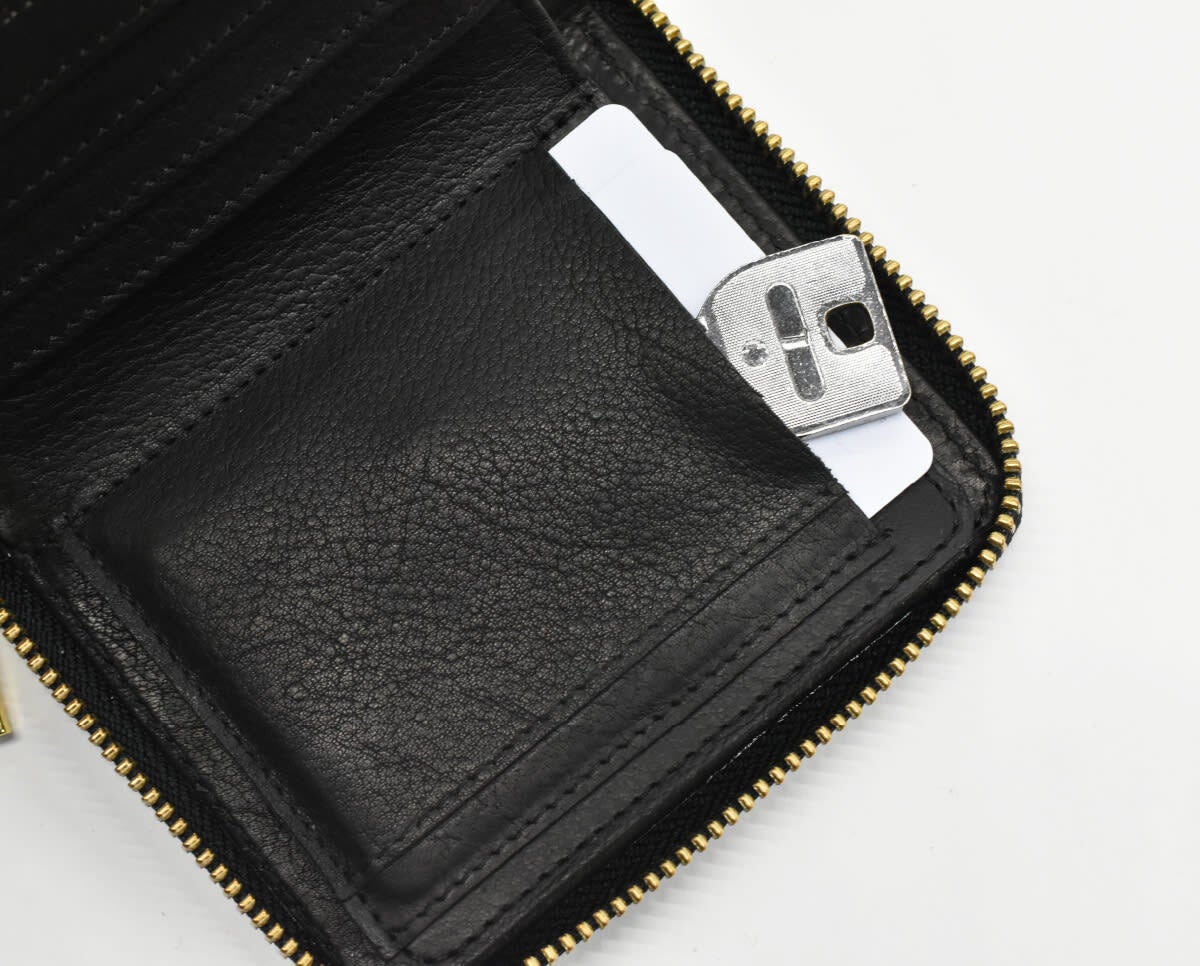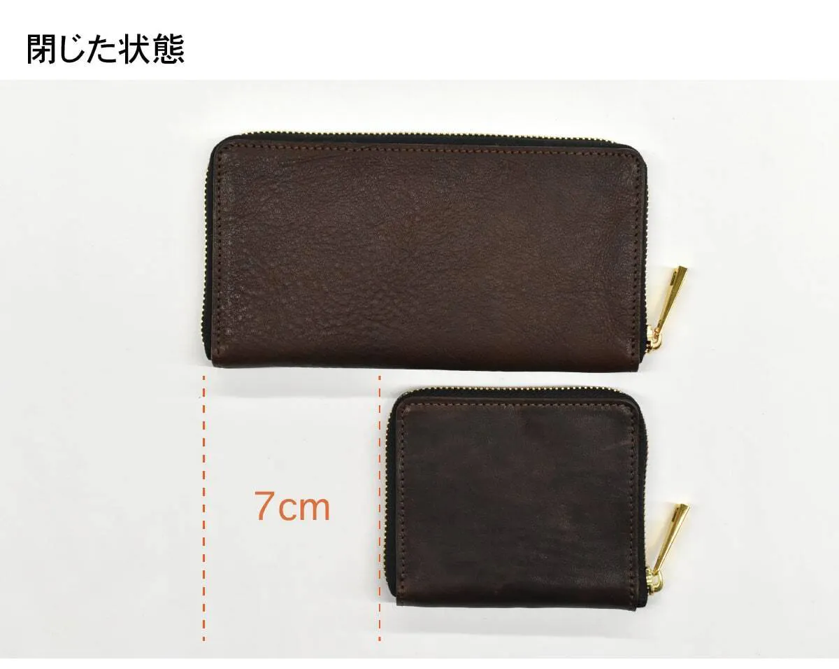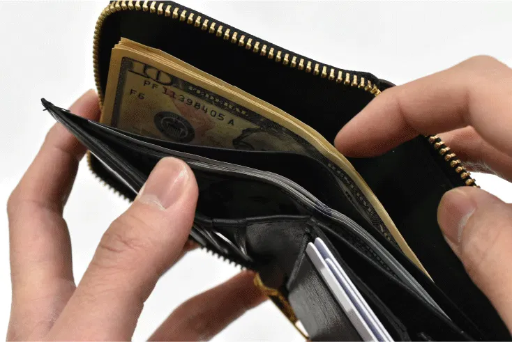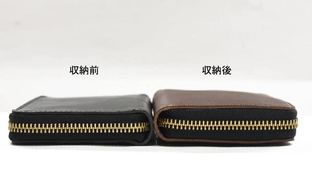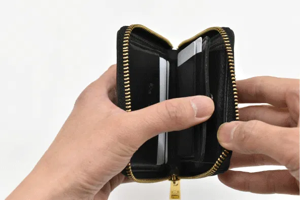 一般的な二つ折り財布では鞄の中で中身が散らばりそのまま紛失してしまうということも。 鞄の中に入れても中身が散らばらないよう3面がしっかり閉じたラウンドファスナー式にすることで大切な中身を守ります。