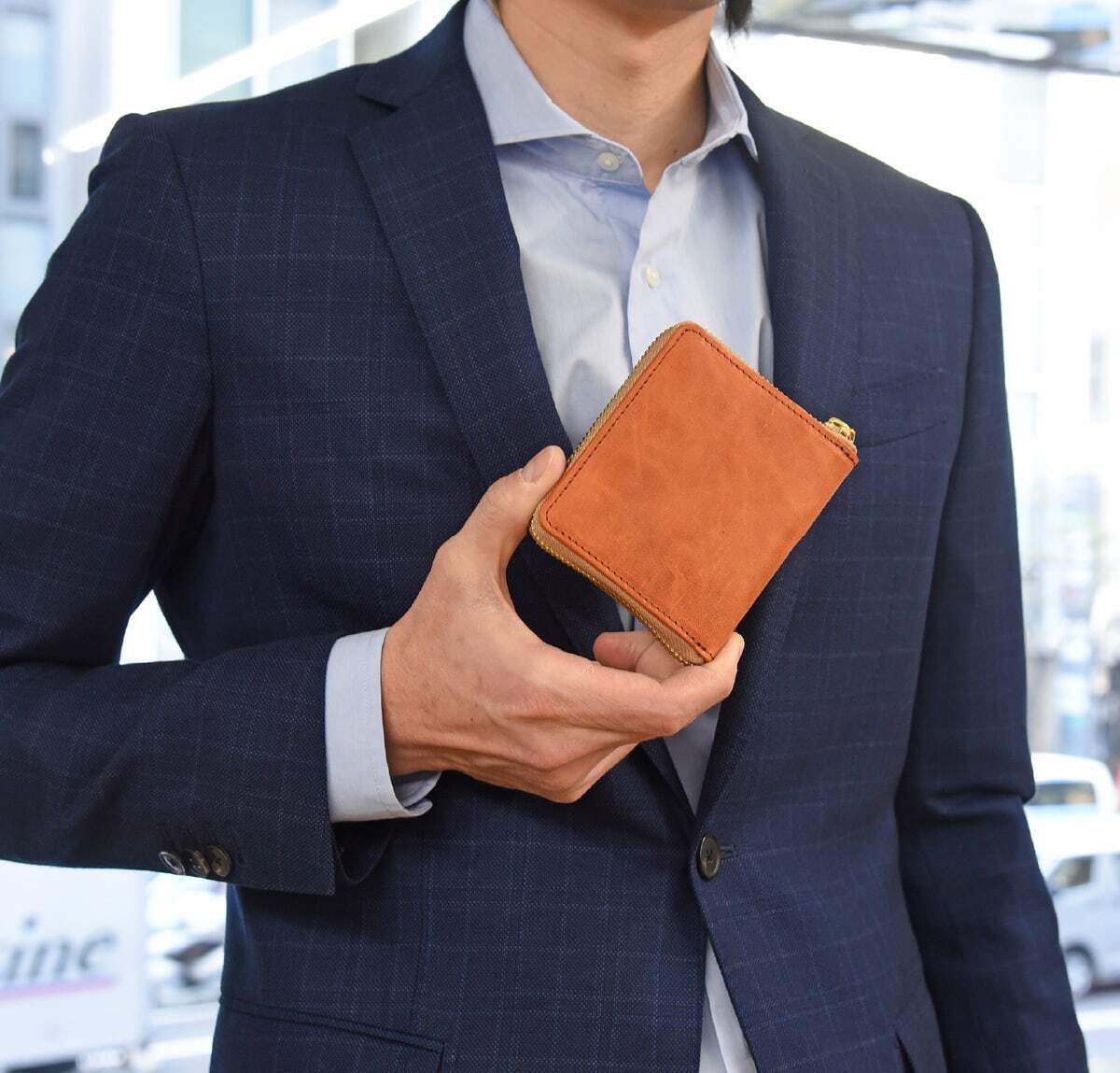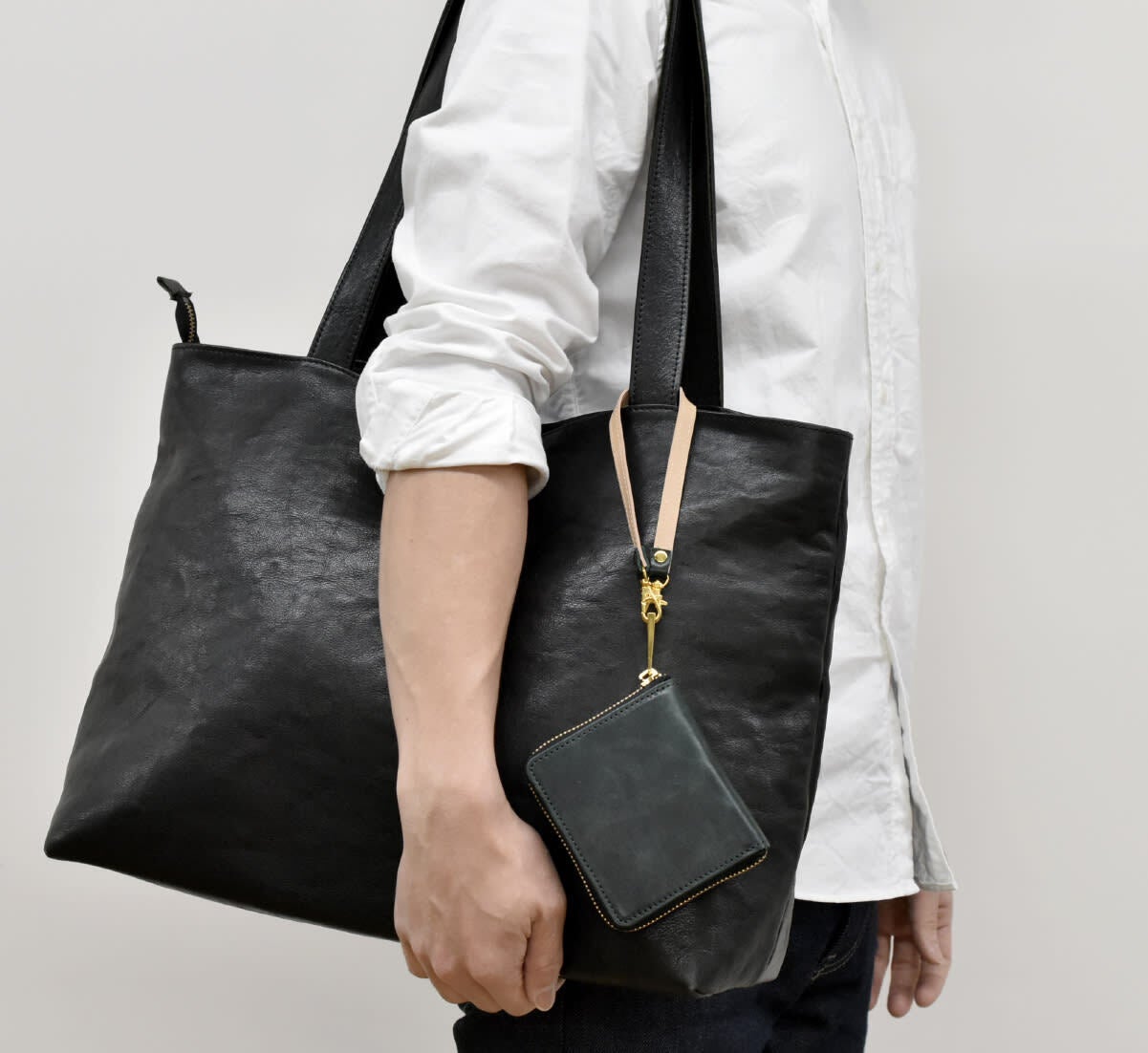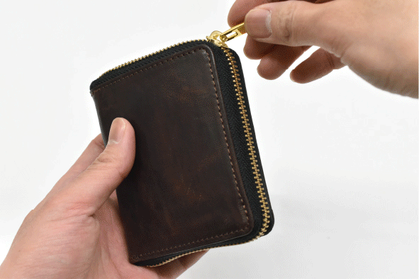 長く使うものだから余計な装飾を施さず、フォーマルスタイルはもちろん、カジュアルスタイルでも、ラウンドファスナー型のフォルムが美しくファッションのスパイスになってくれます。