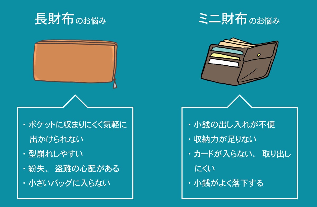 収納力を求めているが長財布だと小さい鞄に入らない、ポケットに収まりにくく落下や盗難などの心配が挙げられます。