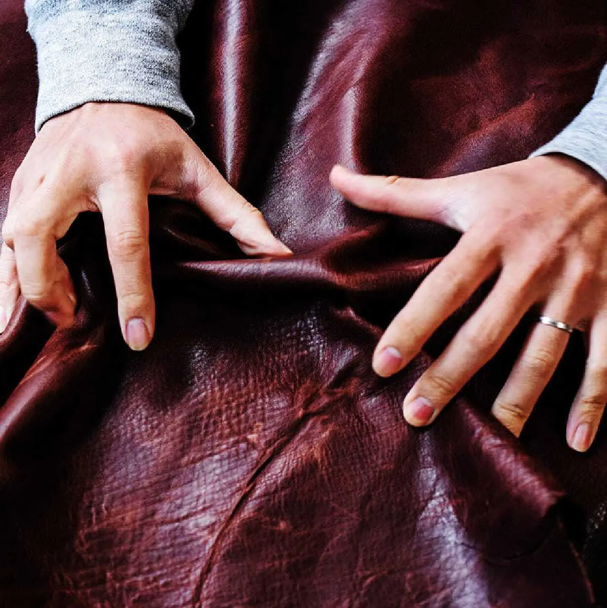 姫路市で作られる馬革はプルアップ加工を施し、手で押し上げたり折り曲げてシワにしたときに濃淡が表れるよう仕上げてあります。