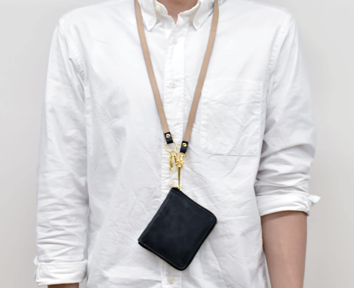 首から下げて使用するネックストラップ。肌身離さず持っていられて、いつでも安心。