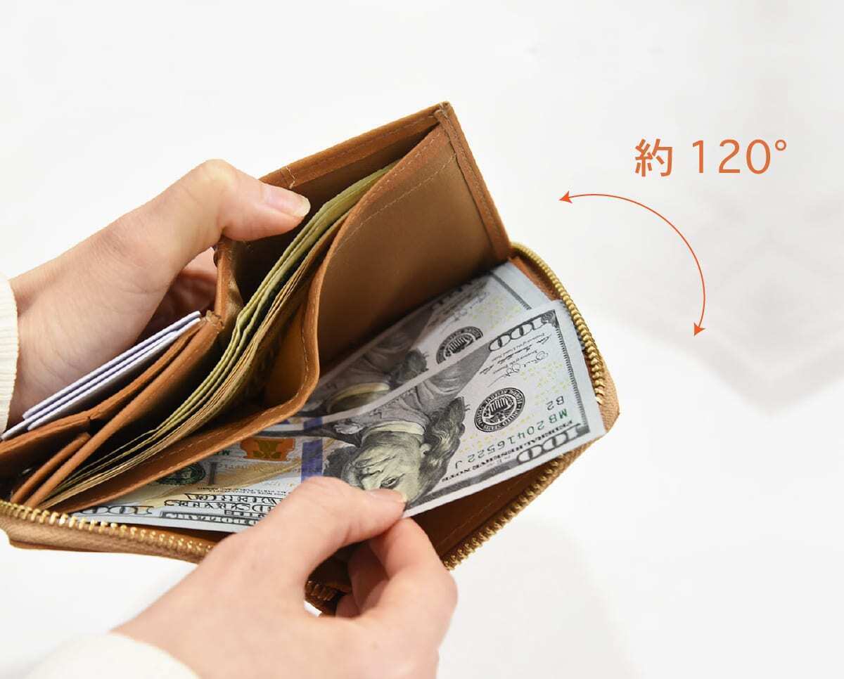 KINKOは約120°開く札入れで取り出しも収納もスムーズで快適です。レジ前でのもたつきはこれだけでもほぼなくなります