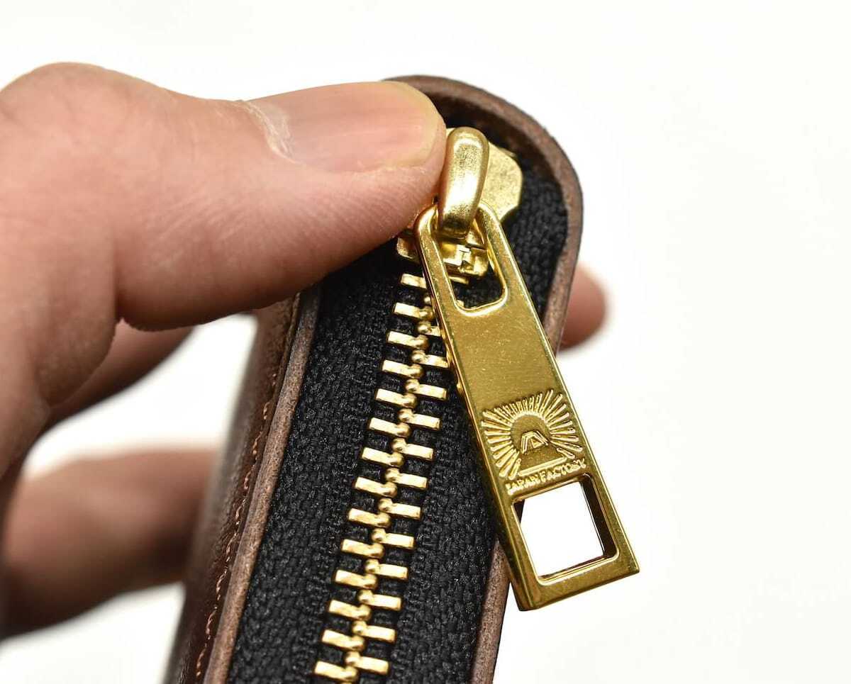 引き手にはスムーズなYKK製を採用。開け閉めの度にストレスが無いのも大きなポイントです。上品な仕上がりになるよう、革と相性の良いゴールド金具を使用。
